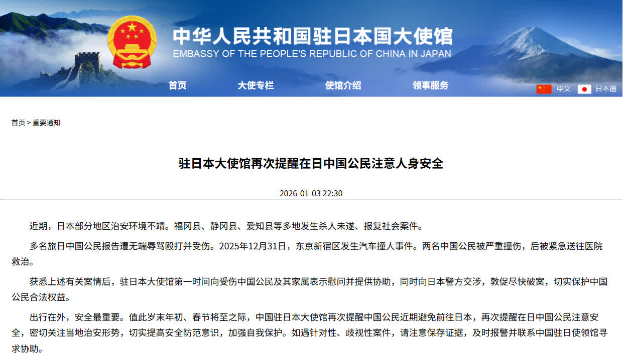 近期,日本部分地区治安环境不靖。福冈县、静冈县、爱知县等多地发生杀人未遂、报复社会案件。 多名旅日中国公民报告遭无端辱骂殴打并受伤。2025年12月31日,东京新宿区发...
