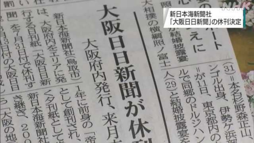 据共同社等日媒报道,6月13日,在日本大阪府发行的地方报纸《大阪日日新闻》宣布将于同年7月底停刊。关于停刊的理由,大阪日日新闻社解释称:“受物价高涨影响,报纸所用的纸张价格大幅上涨,报社的经营面临着前所未有的严峻形势。”