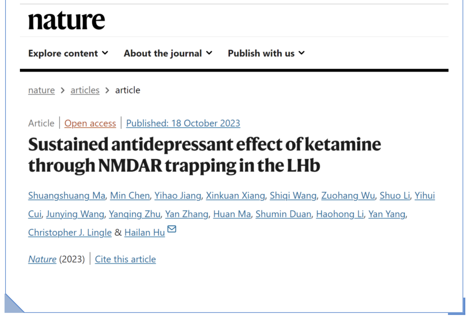 这项与几亿患者相关的科研成果,在北京时间2023年10月18日刊登于国际顶级期刊《自然》上。浙江大学胡海岚教授团队,继2018年在《自然》发表长文之后,在这里又一次发表进一步的研究成果,为氯胺酮为何药效特别持久的问题提供了答案,也为未来抑郁症治疗临床用药和新型药物的设计提供了新思路。(据浙江大学微信公众号10月19日报道)