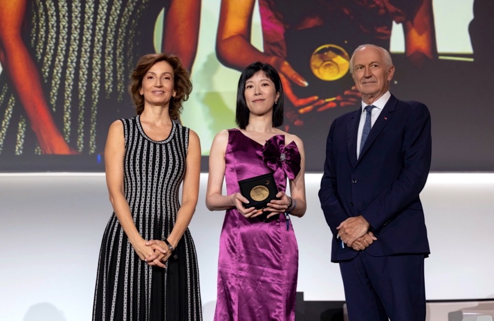(2022年6月24日,联合国教科文组织总干事奥德丽·阿祖莱(左)和欧莱雅董事会主席、欧莱雅企业基金会主席安巩(右),为胡海岚(中)颁发2022年“世界杰出女科学家成就奖”)