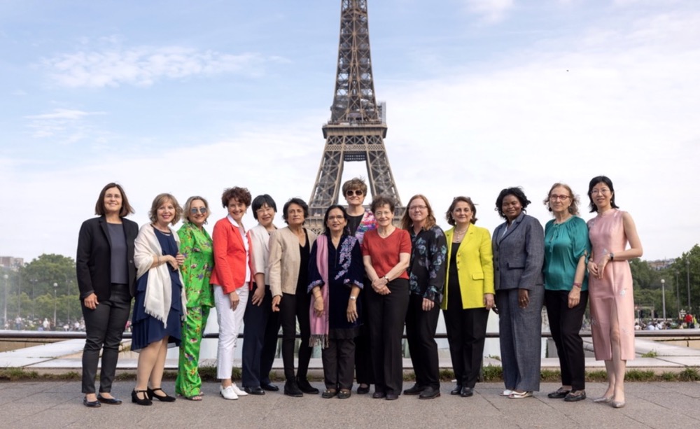 (胡海岚(右一)和卡塔琳·考里科(图中)等获奖女科学家在法国巴黎埃菲尔铁塔前合影)