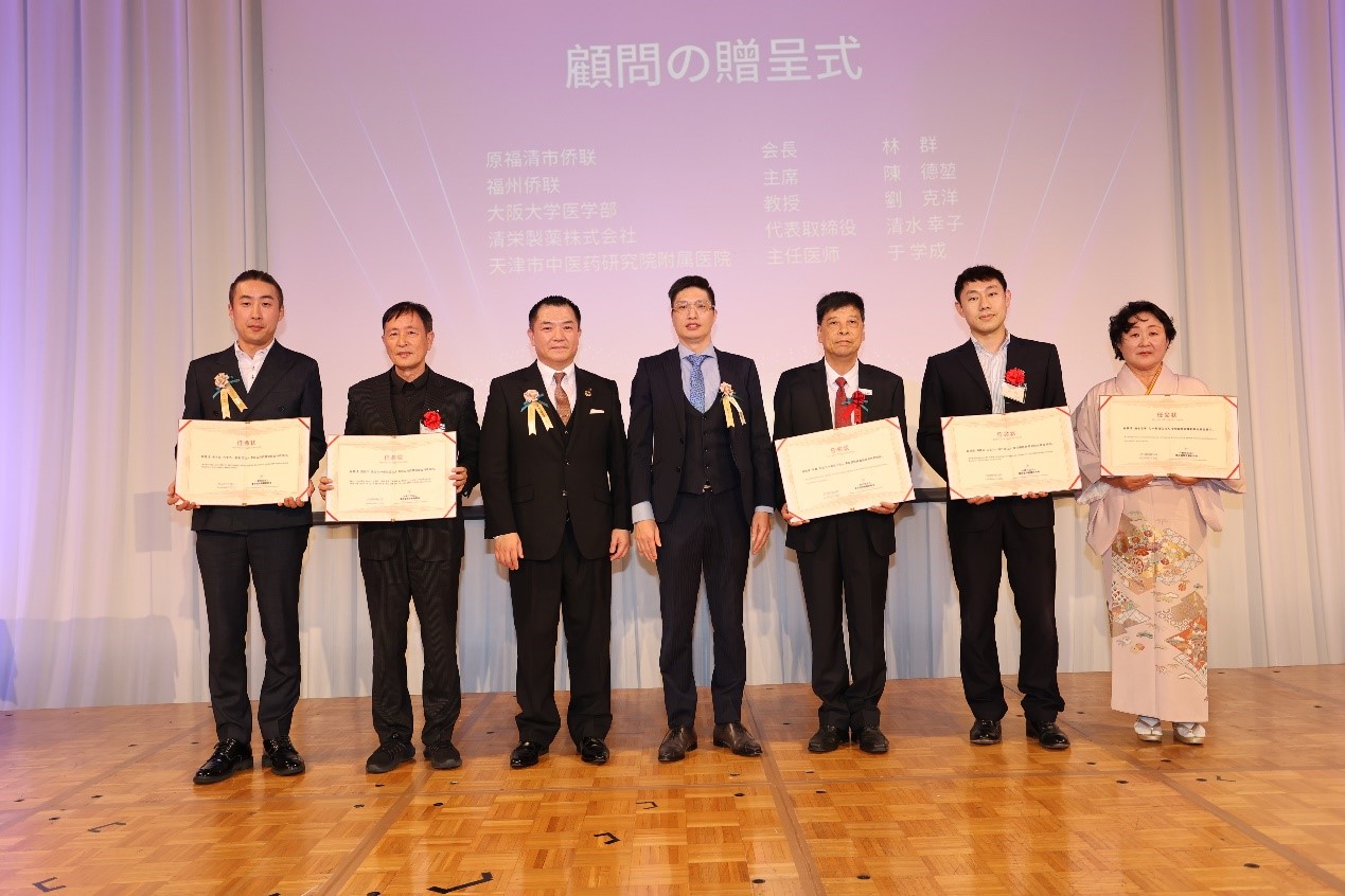 在如潮的掌声中,古川拓海(陈海)会长又代表零和国际商业创新会向原福清市侨联主席林群、福清市侨联名誉主席陈德堃、大阪大学医学部教授刘克洋、清荣制药株式会社代表取缔役清水幸子、天津市中医药研究院附属医院主任医师于学成(稻边秀贤代领)授予“顾问”的聘书。