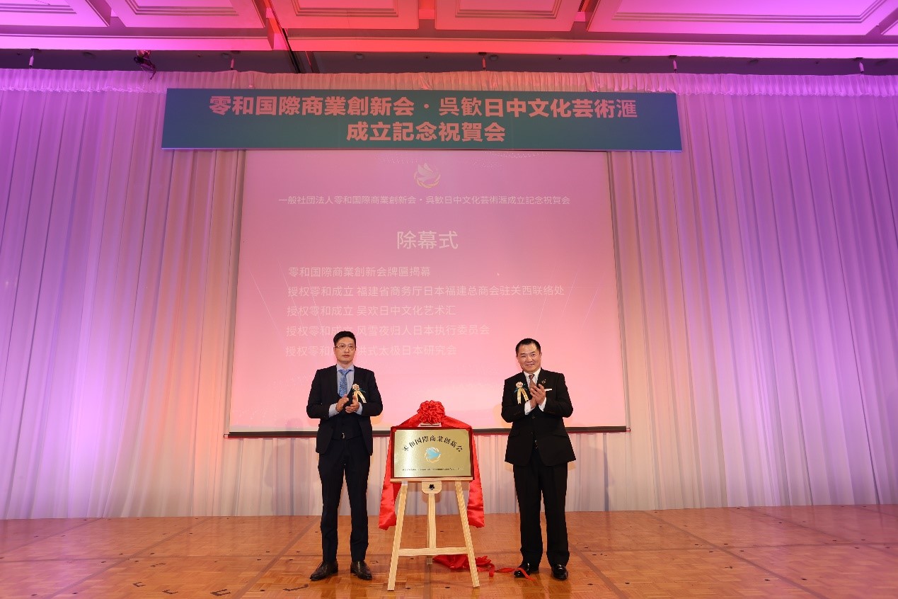 在300多位嘉宾的共同期待下,会长古川拓海(陈海)和执行会长山根亮助共同揭开“零和国际商业创新会”的金色牌匾。