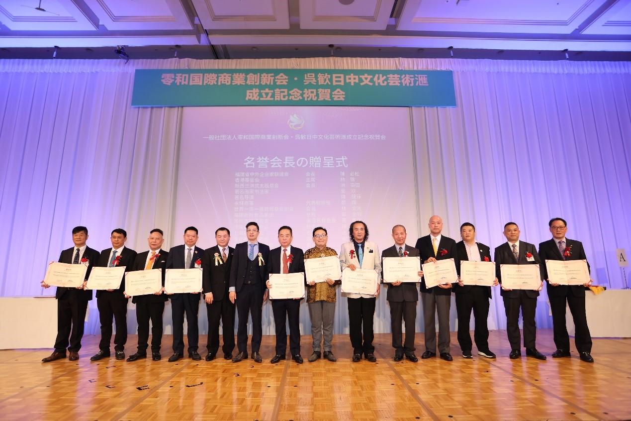 古川拓海(陈海)会长代表零和国际商业创新会向福建省中外企业家联谊会会长陈必松、香港基金会主席林锦、新西兰洪式太极总会会长洪卫国、著名书画家吴欢、著名导演陈健骊(吴欢代领)、永辉商事代表取缔役郑辉、世界一带一路商贸总会创会会长林文光(山口信一代领)、苏州市福建商会永远名誉会长黄亚强、河南省福建商会秘书长陈平华、上海福建商会名誉会长占万龙、淮北市福建商会会长俞爱斌、老挝中国福建商会会长陈熊官等嘉宾授予“名誉会长”的聘书。