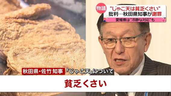 一言既出,秋田犬也难追。10月23日,日本秋田县知事佐竹敬久,在公开演讲时评价爱媛县的特产——杂鱼天(炸鱼饼)“看起来很寒酸”,引起民愤。只不过,引起的是秋田县的民愤。
