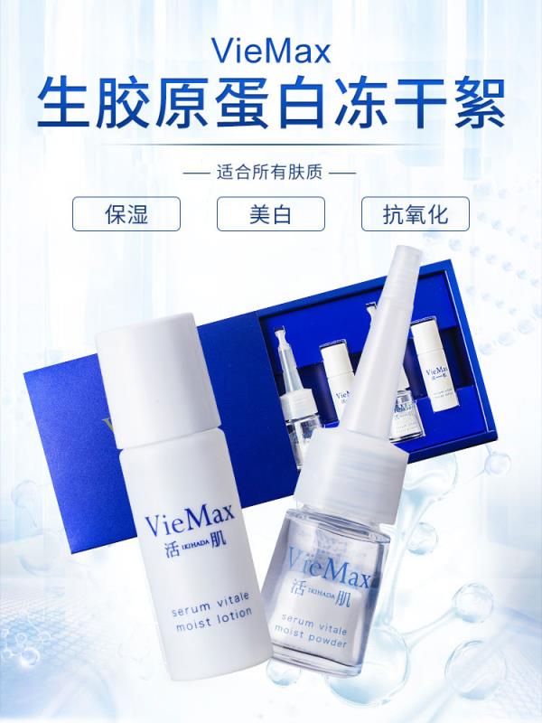 川井制药株式会社所研发的VieMax活肌生胶原蛋白美容液(冻干絮),由两部分——生胶原冻干粉和生胶原美容液共同组成。使用时,将生胶原冻干粉倒入同套配装的生胶原美容液内,摇匀至粉末融化,轻轻涂抹于清洁后的面部及颈部,按摩吸收即可。整套产品,活化营养,自然保鲜,调配方法便捷,护肤程序简单。