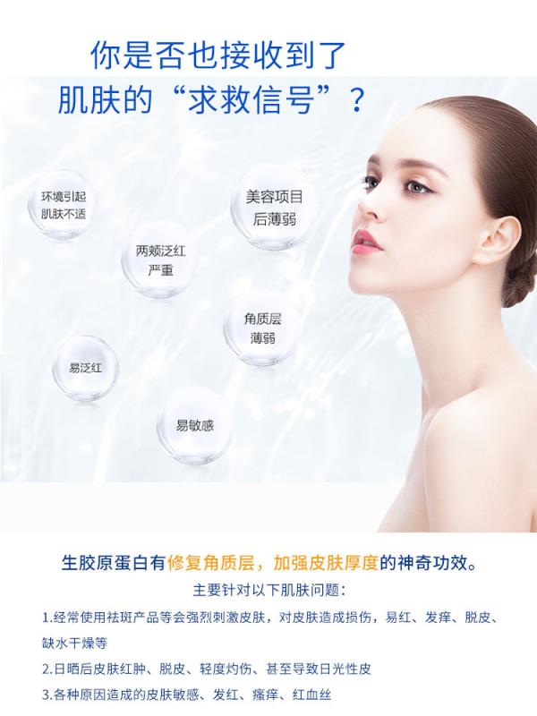 生胶原中富含大量EGF (表皮细胞生长因子)、FGF(成纤维细胞生长因子)、KGF(角质细胞生长因子)。这些生长因子能刺激细胞生长、增殖、愈合和分化,对于敏感肌、干燥肌、皮肤损伤,以及季节变换引发的皮肤问题都能起到明显的修复和改善作用。这些,已经成为护肤界的共识。