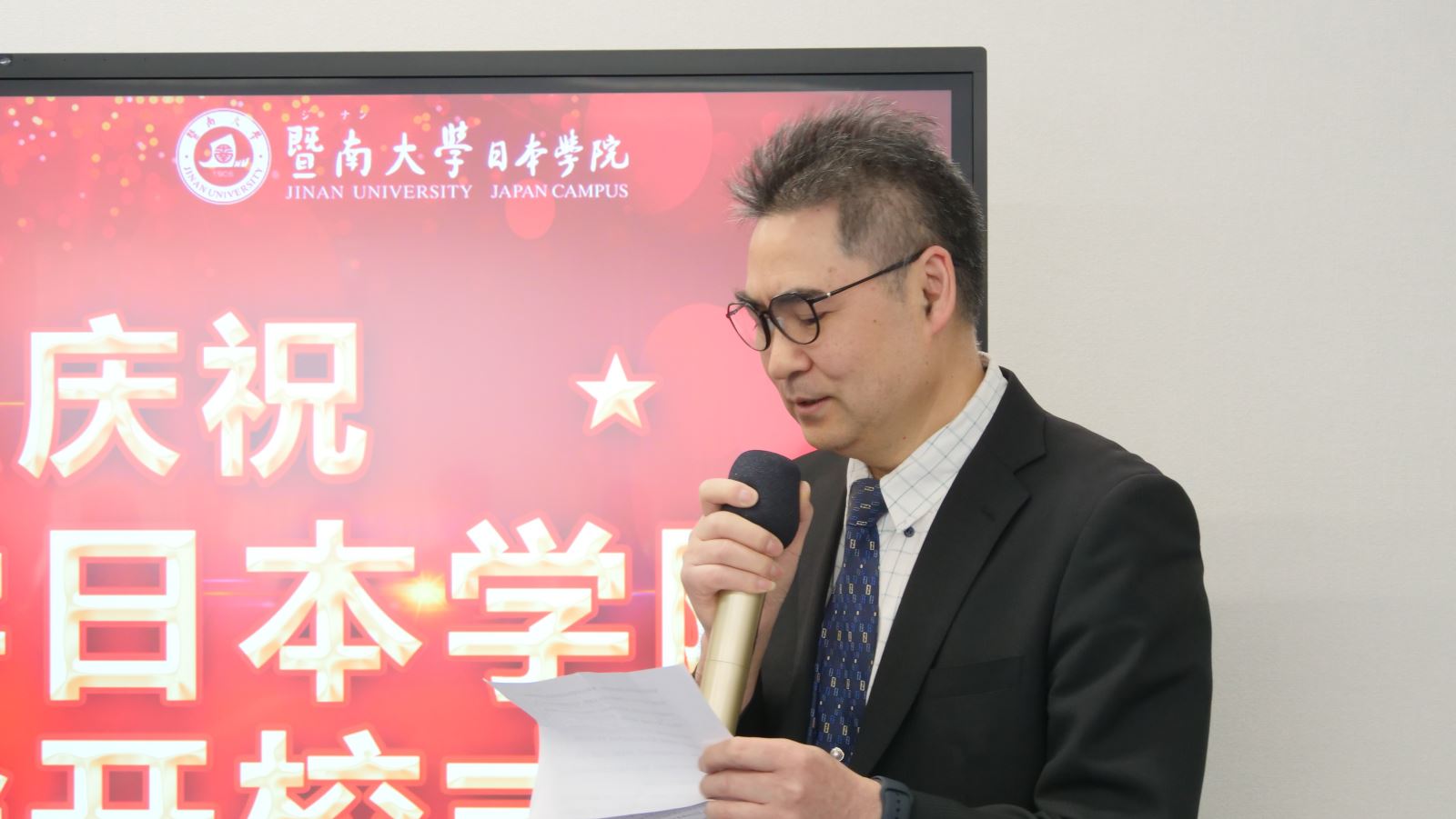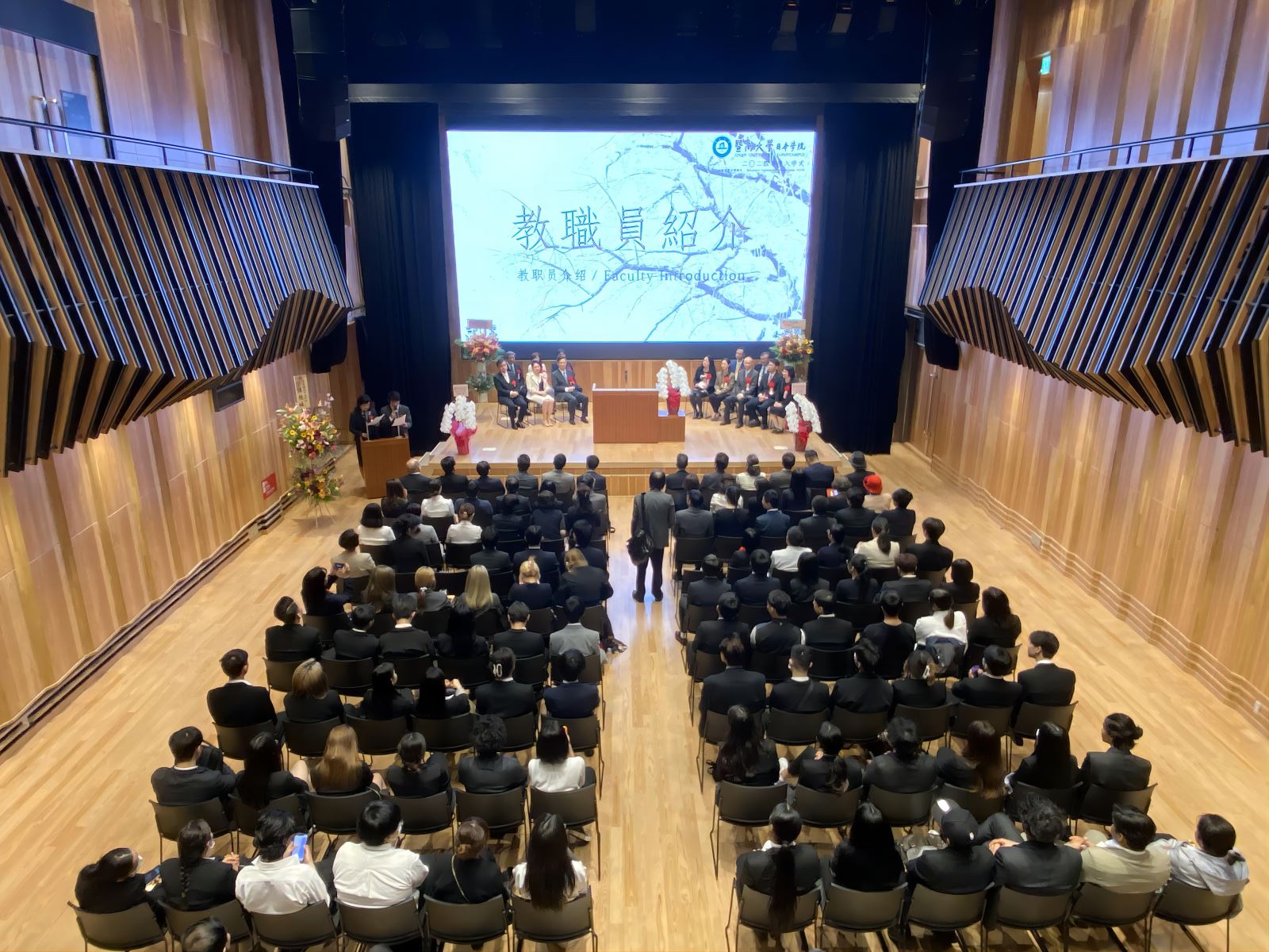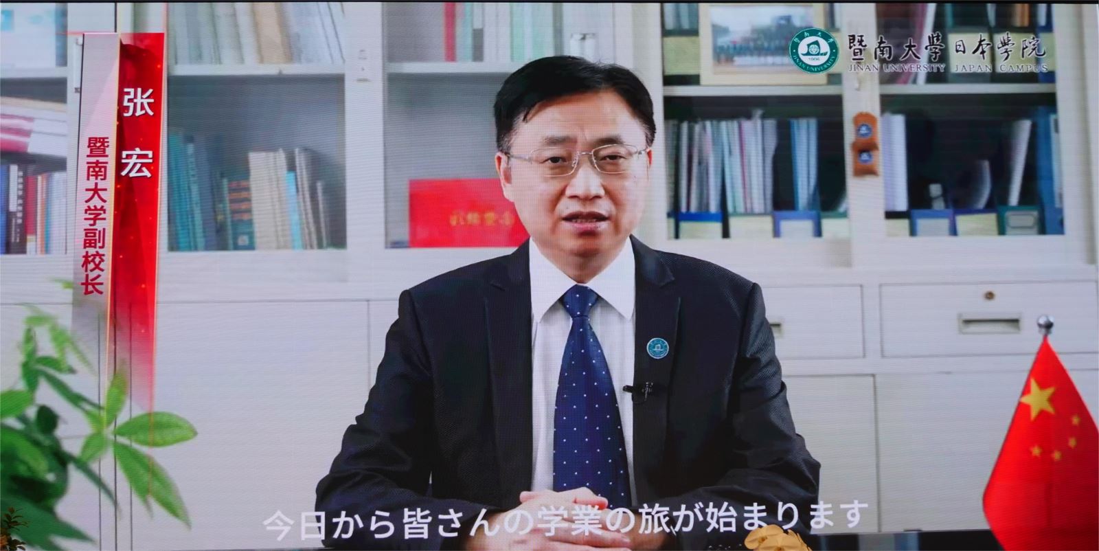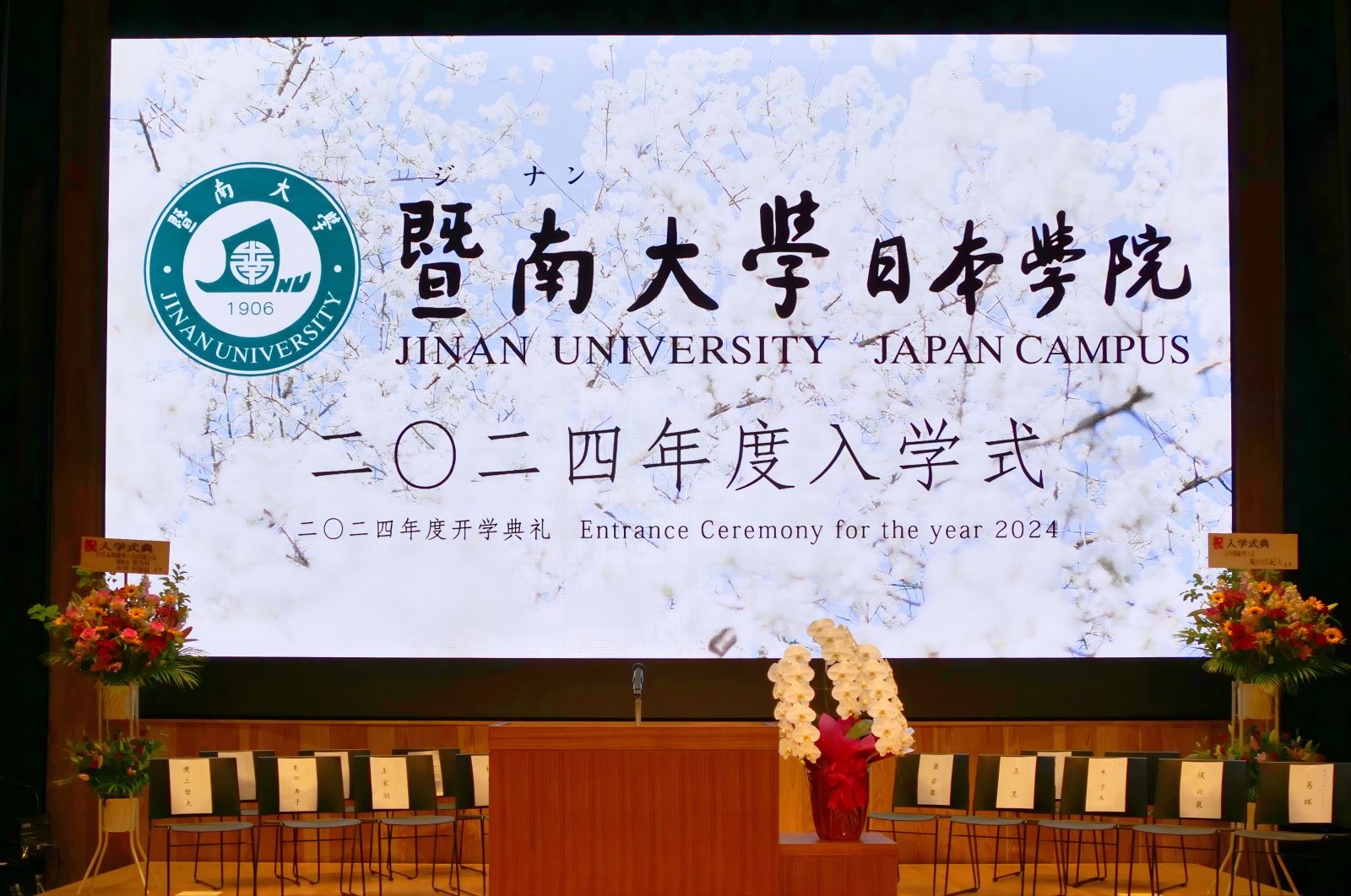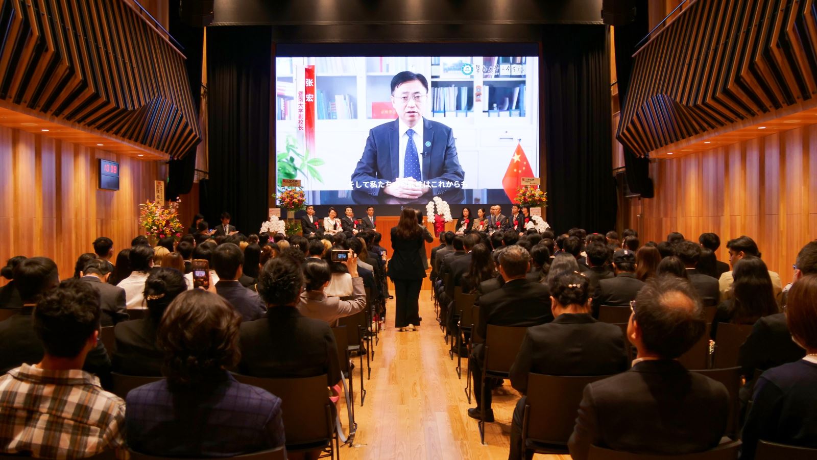 暨大校歌响彻丰岛区区民中心,2024年度开学典礼正式拉开帷幕。暨南大学副校长张宏通过视频向新生表示祝贺,他充分肯定了暨大日院作为暨南大学首个海外校区,是暨大海外办学重要里程碑的特殊意义。