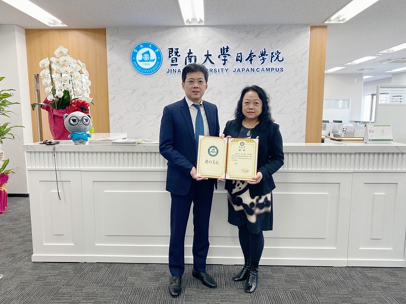 蒲若茜院长为方永义董事长、日本中华总商会评议员会长严浩、青年篆刻艺术家王浩之颁发“客座研究员”聘书,并向关心暨大日院的各界嘉宾颁发感谢状。