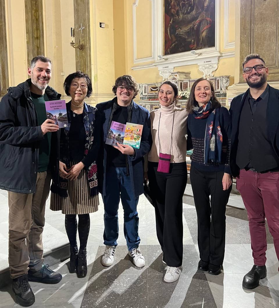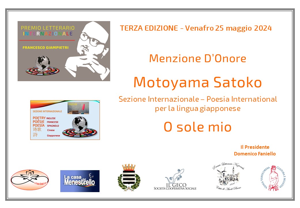 元山里子回顾说:“2023年11月25日至12月2日在弗沃里·皮克老师的安排下,元山里子的意大利译文两本新书《月寿司-女•男》(Moon sushi -Donna•Uomo)和《幸子太太眼中的幸福》(Lafelicita secondo Sachiko)及与6位意大利诗人和5位日本诗人的《意日双语诗合集》(ITALIA-GIAPPONE IN POESIA/イタリアと日本の詩の散策)三本书在意大利巡回签名会时,弗沃里老师用意大利语朗诵这首《啊,我的太阳》,博得热烈掌声,那掌声将会伴随我继续创作!”