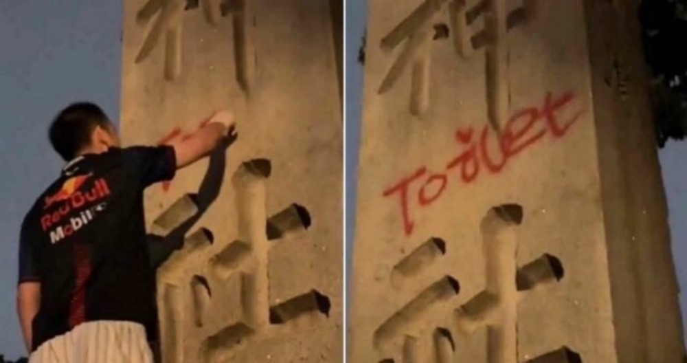 于是铁头远赴日本,站在日本靖国神社的石柱旁小便,并且用红油漆在石柱上写了英文toilet,于是“靖国神社”变成了“靖国神厕”。