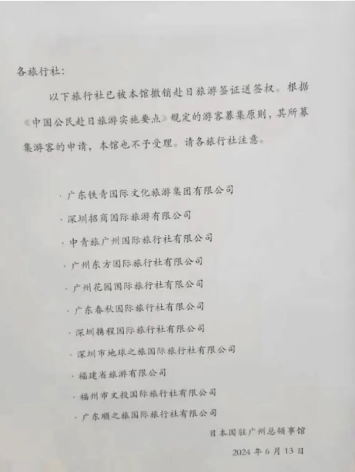 6月15日,国内知名媒体网易转发了一篇来自《环球旅讯》的文章,标题为《多家中国旅行社被日本取消“送签权”,原因竟是?》,将矛头直指靖国神社事件。文中称:“根据网传资料,广州领区(广东、广西、福建、海南)有11家知名旅行社,被撤销了赴日旅游签证送签权。”这些旅行社包括广东铁青国际文化旅游集团公司、深圳招商国际旅游公司、中青旅广州国际旅行社公司、广州东方国际旅行社公司、广州花园国际旅行社公司、广东春秋国际旅行社公司、深圳携程国际旅行社公司、深圳市地球之旅国际旅行社公司、福建省旅游公司、福州市文投国际旅行社公司、广东顺之旅国际旅行社公司。