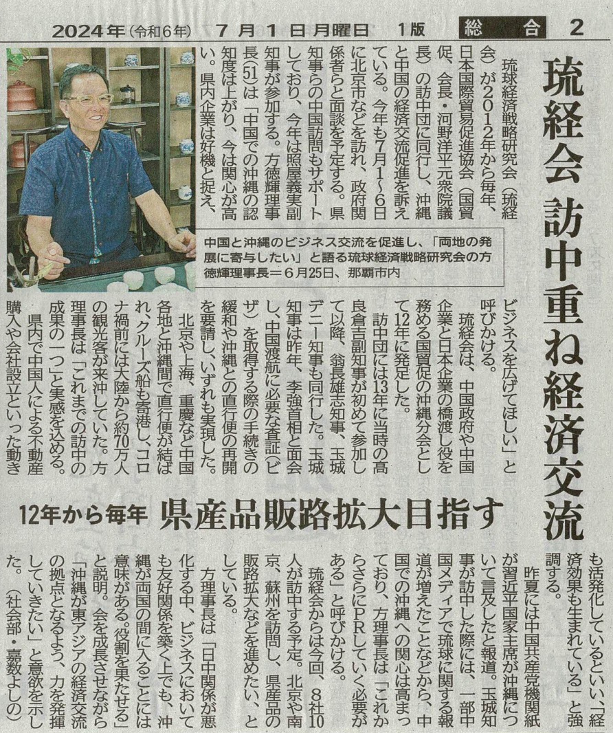 琉球经济战略研究会理事长、DIRECT CHINA株式会社代表取缔役方德辉是该会创办人,此次率研究会6家公司9名会员参访。他曾向日方提出“再建琉球大交易时代”。用他自己的话讲,倡言背后是重要性日益增强的对华交流与务实合作,需要双方相向而行,既重视传承,又做好发扬。包括河野洋平先生在内,日方老一辈友好人士们数十年坚持,众议院议员、日本前首相桥本龙太郎之子桥本岳等新生代表正在“接棒”,体现着日方在传承和发扬方面所做的努力。对此,中国全方位创造畅所欲言的交流环境,积极回应,充分展现了一种信任和真诚姿态。