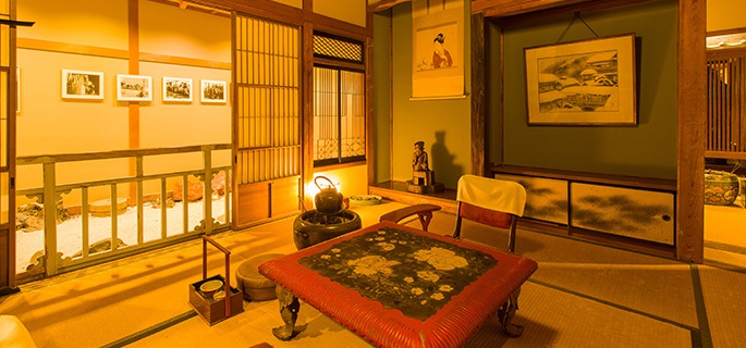 在“驹子的房间”,一位和服少女背过身去,端坐窗前,她的眼神投向遥远的未知之地。据说,这间房是按照小说原型松荣在昭和初年生活的样式复原的。