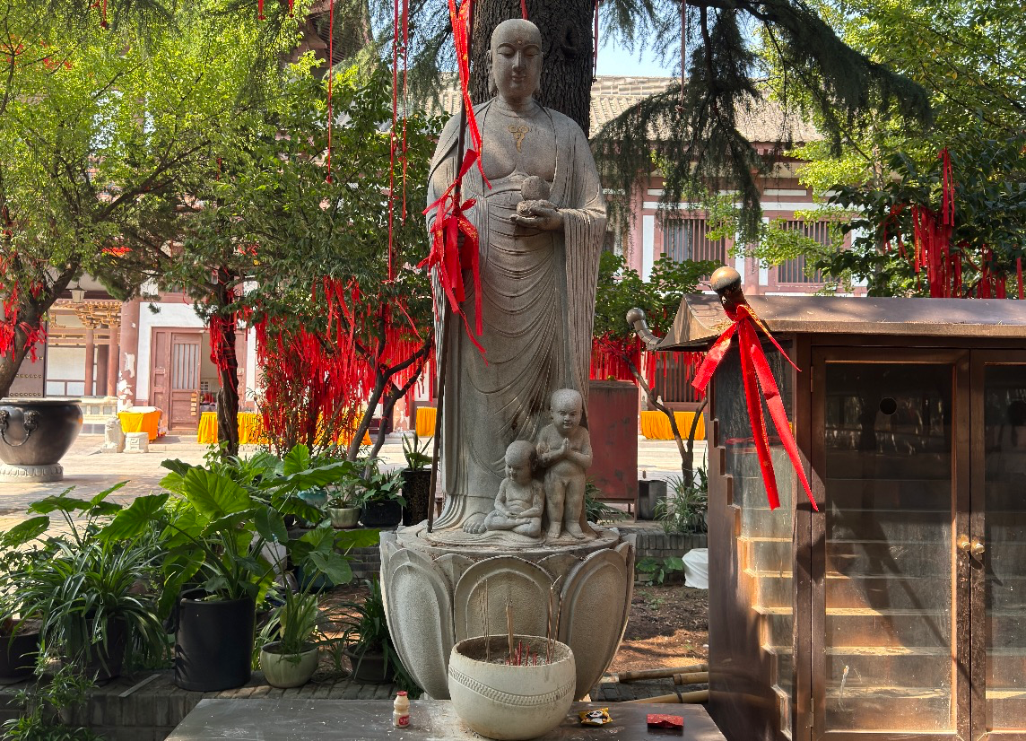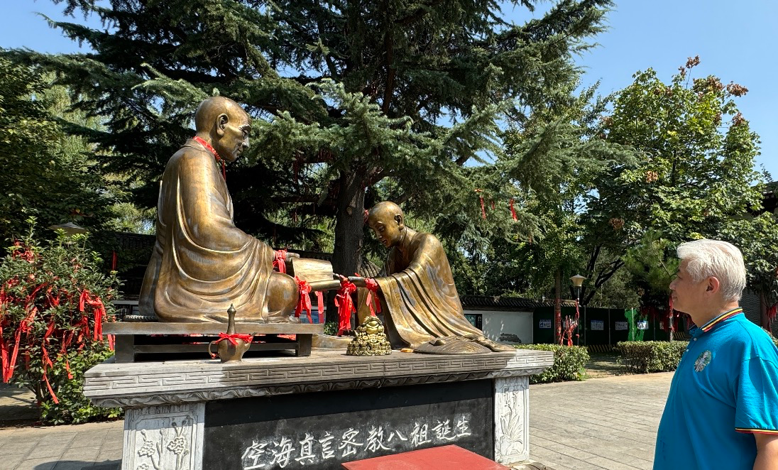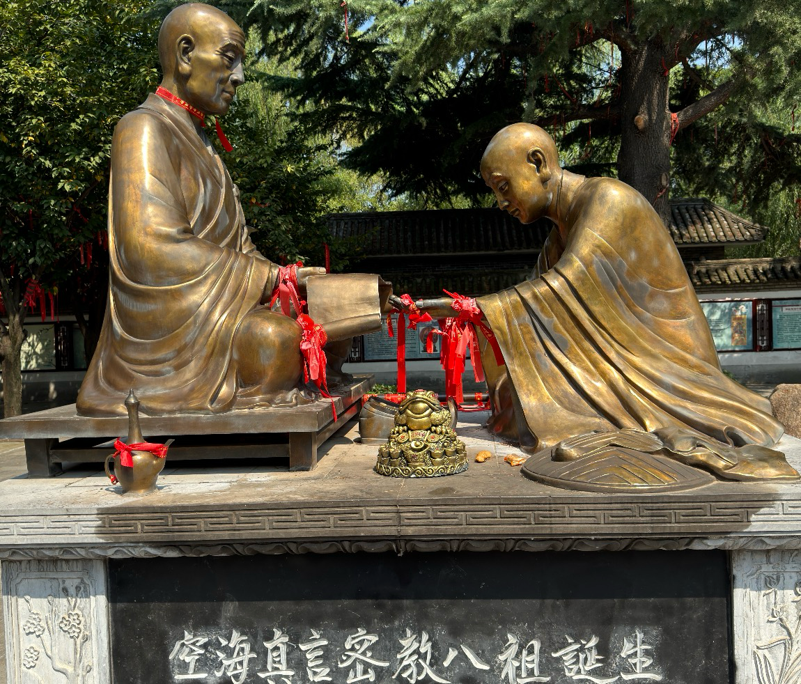 我们还在“青龙寺”的寺院里看见一尊名为“空海真眼密教八祖诞生”的雕像。那空海跪坐在地,低头、弯腰,以“低到尘埃里的谦卑”接受挺直着腰板坐在那里的惠果大师的指教。