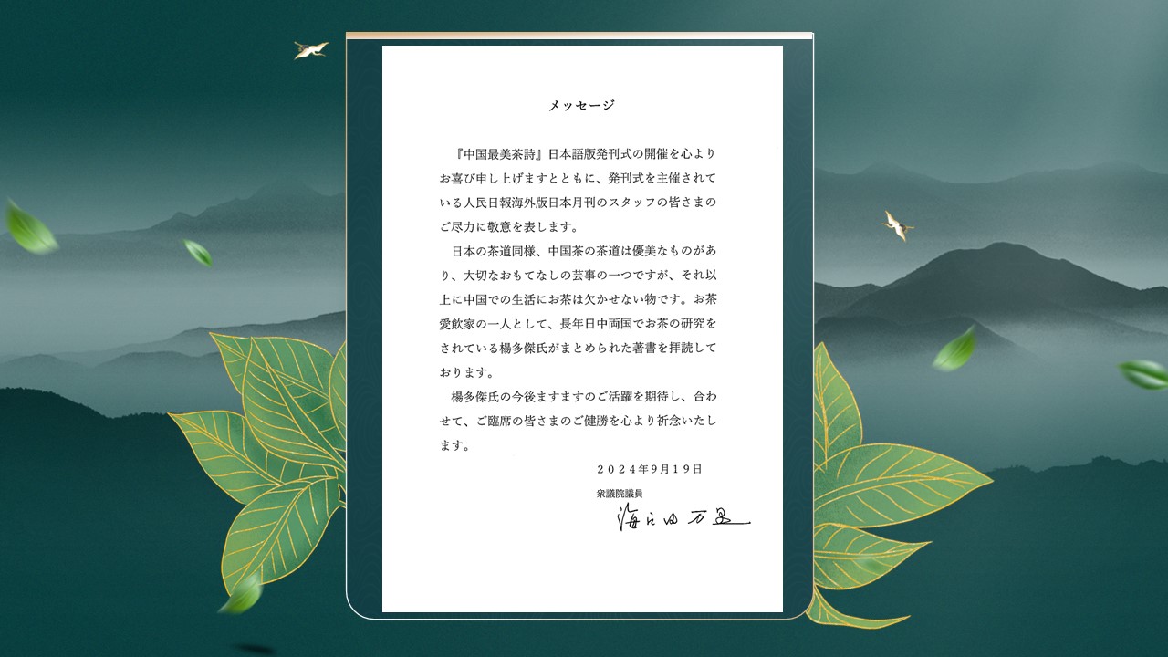日本众议院副议长海江田万里特意发来贺信对《中国最美茶诗》日语版的出版表示祝贺,日本顺天堂大学教授汪先恩代读了贺信。海江田万里在贺信中表示,作为茶和中国文化的爱好者,他读完了这本著作,他要向作者杨多杰及《人民日报海外版》日本月刊、日本东方出版社致谢,感谢他们为推动中日两国文化交流做出的努力。
