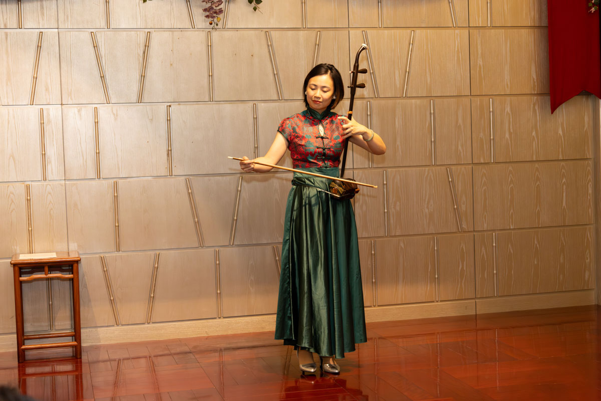 广东蒸点心、红烧鱼翅羹、马告粉丝虾球、姜葱老酒炒腐竹卷、葱油炒芋艿、大良炒饭……在美食美酒相得益彰,大家陶然品鉴的同时,活跃在中日两国的女演员中西悠绮用中文演唱了《我只在乎你》,在日本备受关注的二胡青年胡演奏家周昂则用琴弦触及人心,为活动增添了一份文化共鸣。