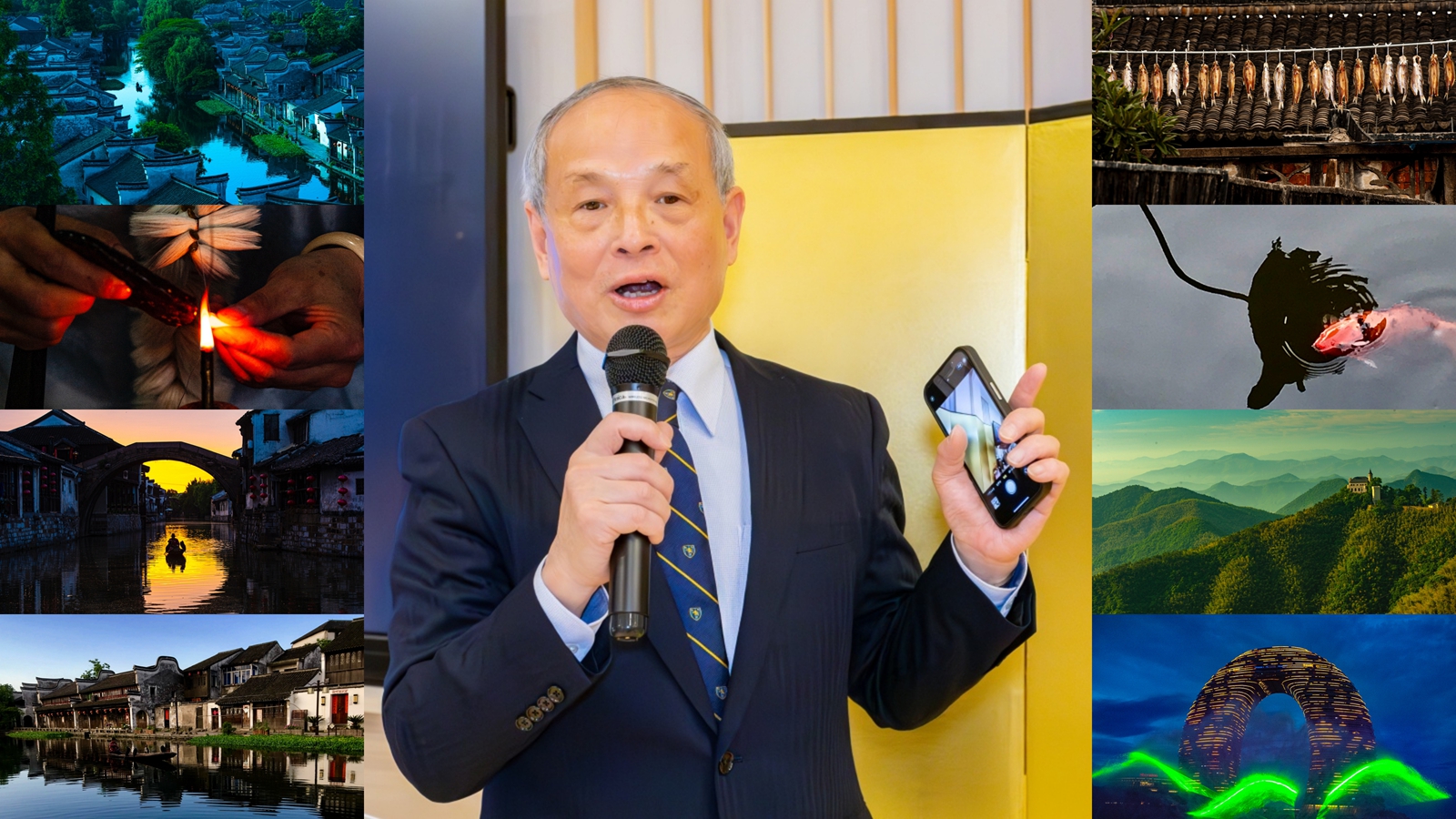 在日华人摄影交流协会会长冯学敏回顾了与上海大学的缘分,追忆了其代表作《湖州印象》系列摄影作品的拍摄经历,介绍了以视觉语言等文化意象为桥梁联通中日两国友谊的心得。