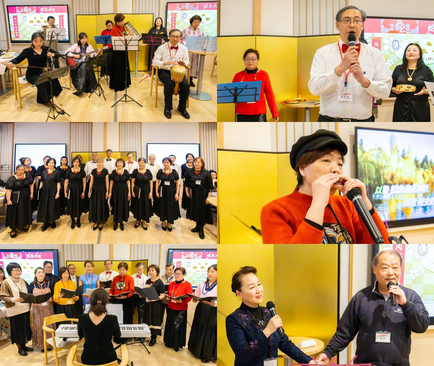 文艺表演环节,尽显校友们的多才多艺。小乐队以欢快热烈的《步步高》开场,瞬间点燃了全场的热情。龚鸣鸣副会长演唱意大利民谣《我的太阳》,感染力十足,赢得掌声阵阵;马玉辉团长携新三届合唱团献上经典曲目《大海啊故乡》和《向云端》,女声小合唱《请到天涯海角来》,清新甜美,拨动心弦;汪启忻总监带来了口琴独奏《爱在深秋》,深情款款,细腻动人;校友陈琦与王溱深情对唱《我和我的祖国》,荡气回肠,反响强烈。压轴登场的是上海大学日本校友会联谊合唱团的大合唱《思念》和《我和我的朋友》,屏幕再现了合唱团与姜育恒在“人生的路”东京演唱会上同台演出的场景,再次震撼了全场。