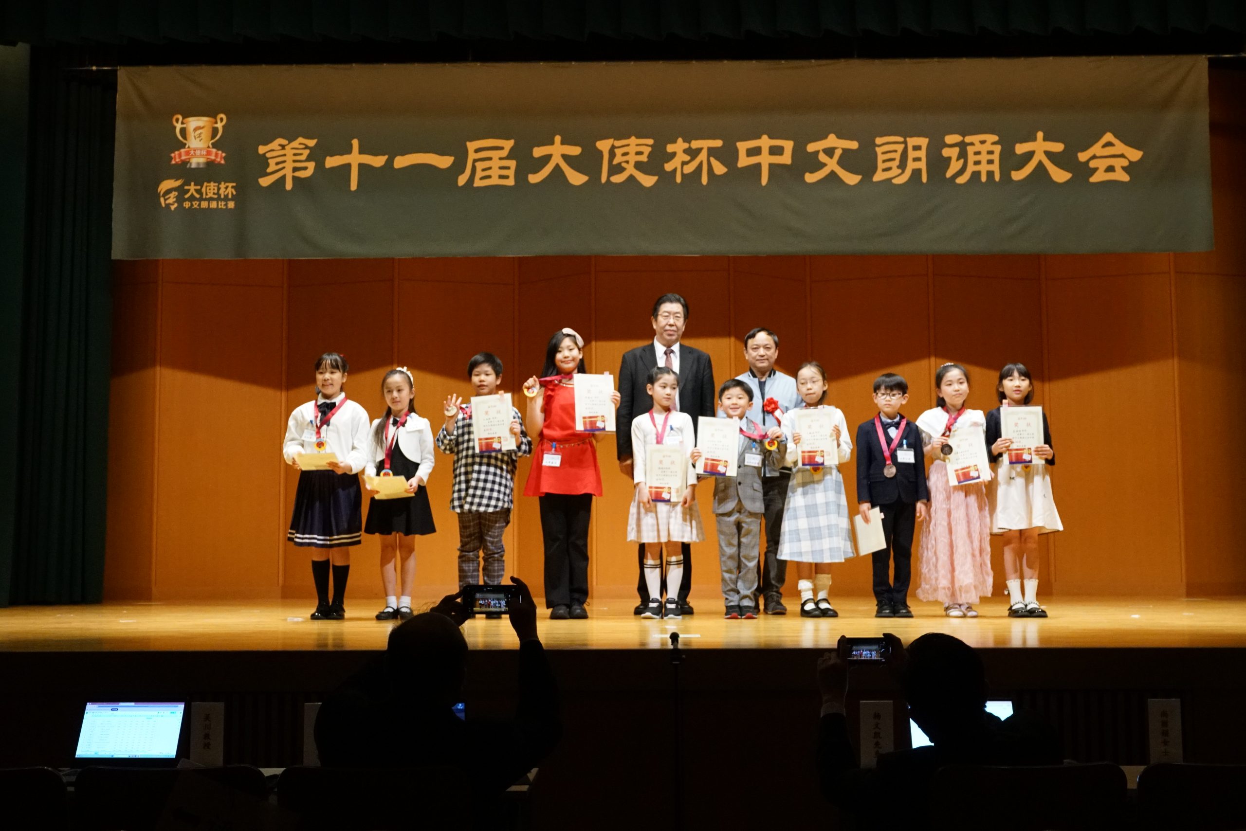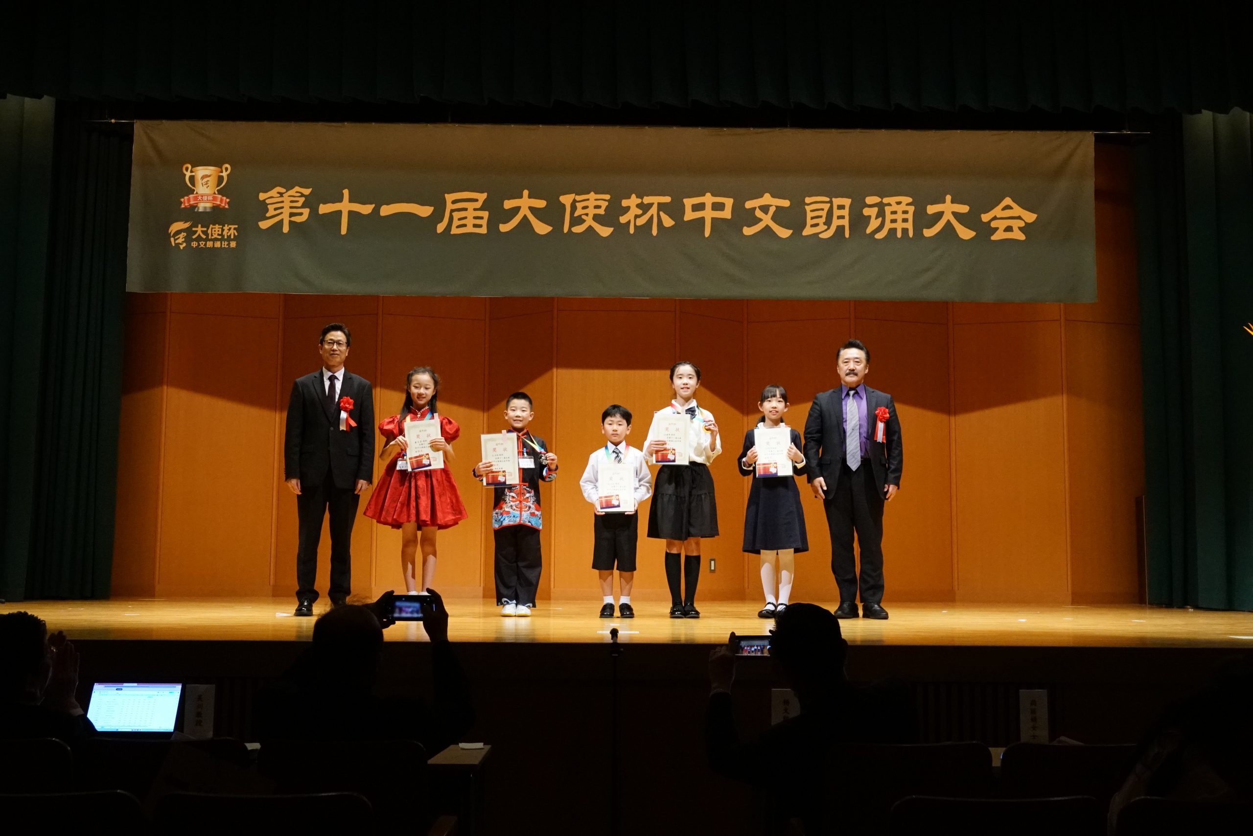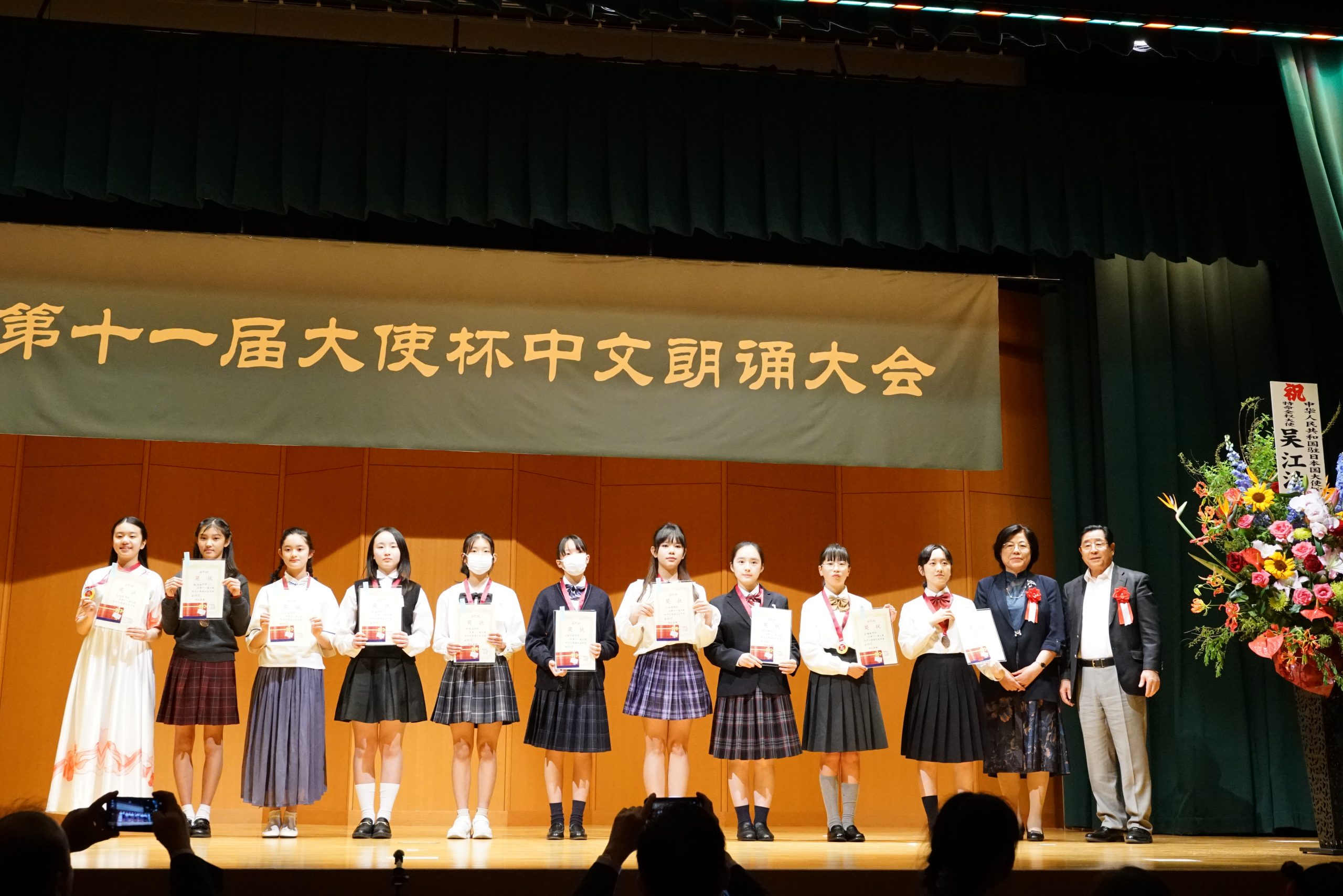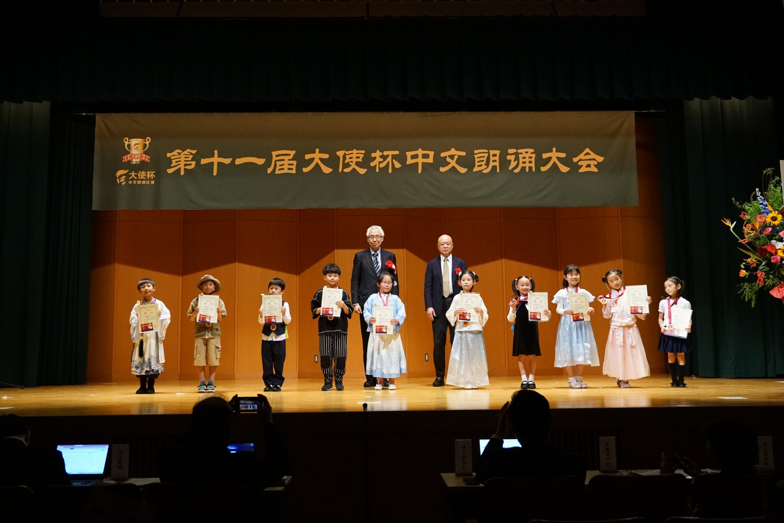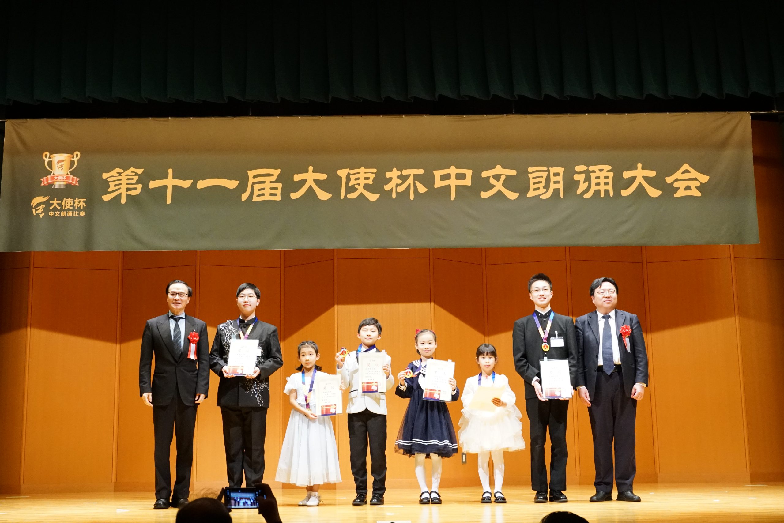 第十一届“大使杯”朗诵大赛共分上午场、下午场及闭幕仪式三大部分。杏林大学教授刘迪、东京话剧艺术协会会长凌庆成、国家一级播音员贾卓炎、武藏野美术大学教授廖赤阳、原中央电视台主播孙靖涵、横滨山手中华学校张岩松校长、《中文导报》社长杨文凯、日本大学教授吴川、原北京人艺著名演员尚丽娟、明星大学教授赵海城等分别担任上下午场的评委。