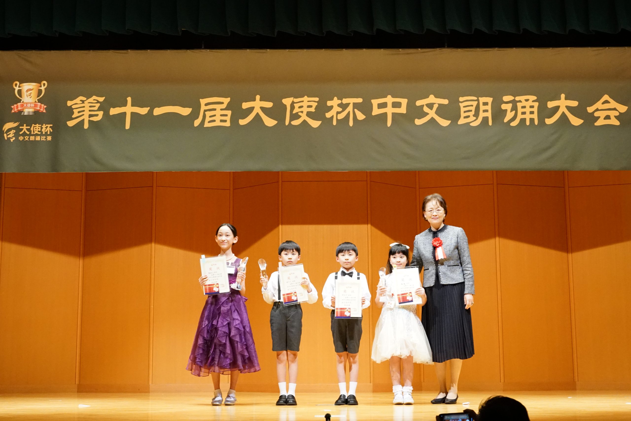 中国驻日本大使夫人、阳光学校校长丁玥出席大赛并为荣膺大使杯奖的选手——魏魏、孪生兄弟黄佐字、黄佑宇和韩菲儿颁发“大使杯”奖。