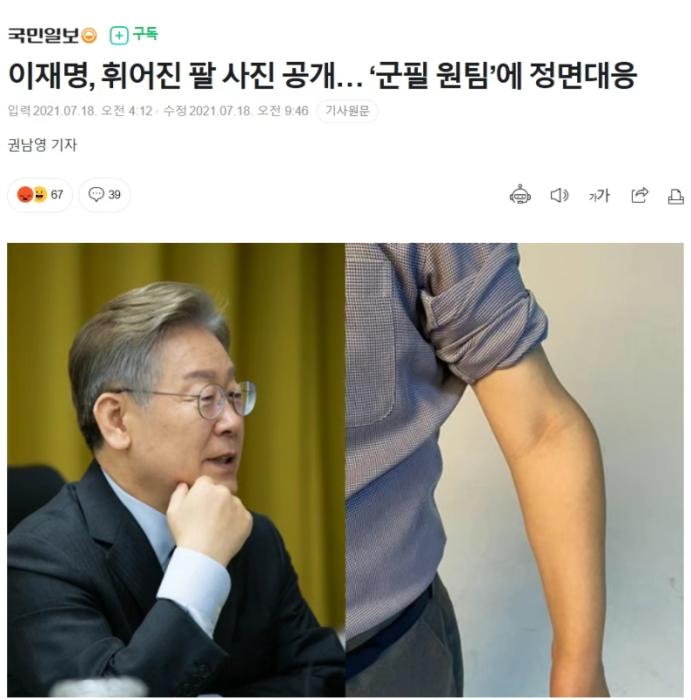李在明左臂明显弯曲。图片来源:韩媒报道截图