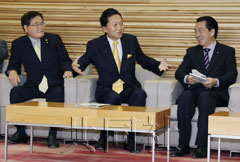 金融相龟井静香、首相鸠山由纪夫、国家战略相菅直人(左起)等29日上午在首相官邸出席内阁会议