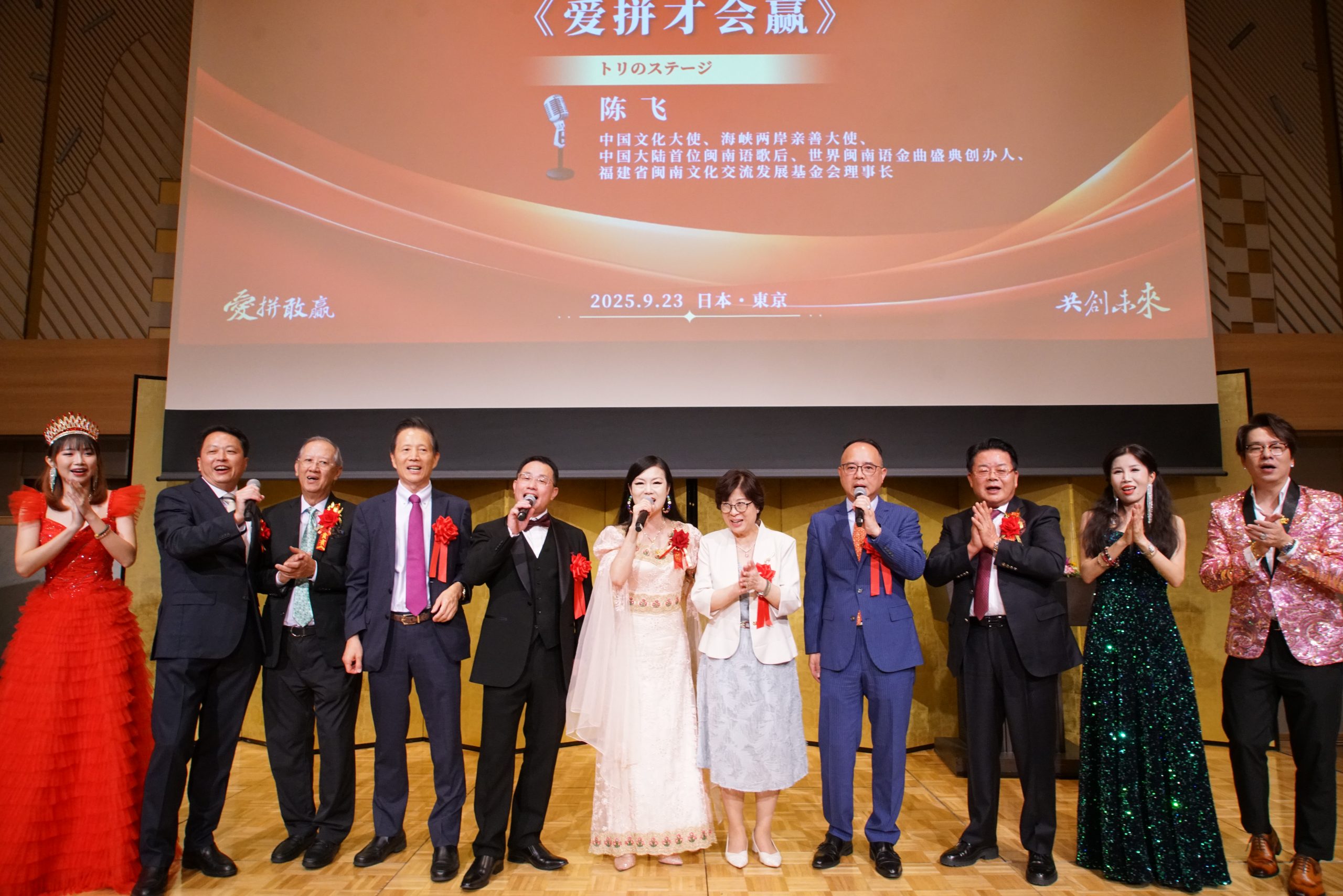 陈飞理事长向新任会长苏勇艺致以热烈祝贺,并深情回忆起三十年前自己就曾怀抱“让闽南文化光耀全球”的梦想,如今看到这颗种子已在日本生根发芽,结出丰硕成果,深受感动。她特别邀请在座嘉宾与世界各地乡亲,于10月赴厦门参加2025世界闽南语金曲盛典,共同见证闽南文化的世界风采。