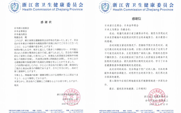 访问活动高效务实,洽谈对接进展顺利,浙江省卫健委合作交流处特意发来感谢信,向负责对接的日本浙江总商会、日本金华商会、日本义乌商会致以高度肯定与诚挚感谢。