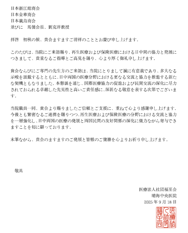 未来,日本浙江总商会及浙系商协会将继续发挥桥梁作用,积极推动中日之间包括医疗健康在内的多领域、深层次的务实合作,为促进日中友好与专业交流贡献力量。