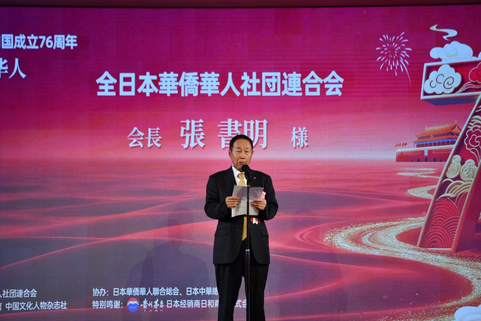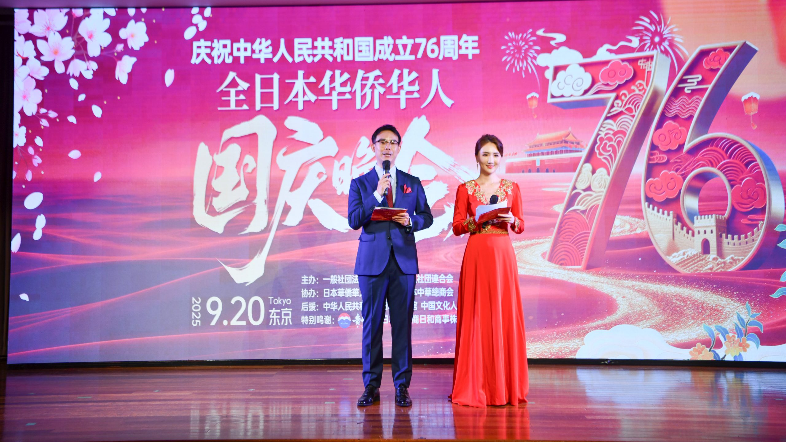 2025年9月20日晚,“庆祝中华人民共和国成立76周年全日本华侨华人国庆晚会”在东京上野百年老店精养轩三楼宴会厅隆重举行。晚会由全日本华侨华人社团联合会(简称全华联)主办,日本华侨华人联合总会、日本中华总商会协办,中国驻日本大使馆支持,贵州茅台酒日本渠道商日和商事株式会社特别协力。