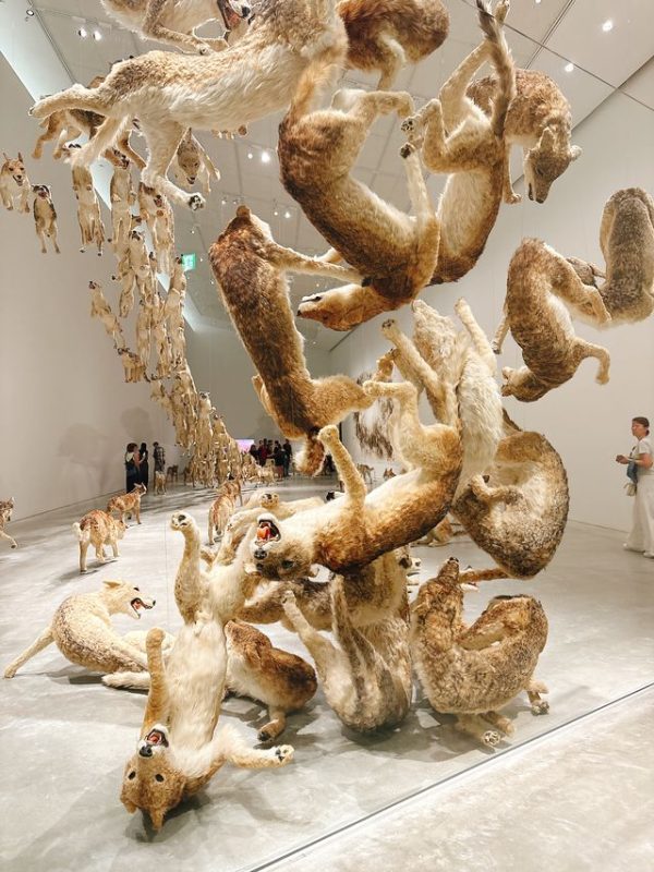 为了迎接时隔三年的濑户内海国际艺术节,直岛新美术馆也于今年 5 月开馆。该馆的建筑设计,仍由日本著名建筑师安藤忠雄操刀,秉承其不避讳展露钢筋水泥本色的风格,在直岛本村地区的高台上,又一座现代建筑悄然生根发芽。开馆纪念展取名为《从原点到未来》,不仅聚焦了世代在濑户内海的岛屿上立身的岛民生活,也介绍了在世界各地活跃的外国艺术家的作品。这其中非常值得一提的,正是中国现代艺术家蔡国强于 2006 年在柏林古根海姆所举办的大型个展中创作的作品《漩涡》。99 匹狼在奋力向前飞奔,却毫不犹豫地撞倒在巨大的玻璃墙上。会场中设置的玻璃墙与柏林墙同高,象征着人与人、不同团体之间无形但却真实存在的思想体系及文化的隔阂。作品中烟花的痕迹,既象征创造又象征破坏,仿佛巨大的漩涡充满活力又力量暗涌。他的创作展示出暴力与美这一相悖的主题,仿佛历史本身同时拥有的颓废与光荣。除此之外,将现代艺术与古典艺术相结合的村上隆的著名作品《洛中洛外图 岩佐又兵卫 rip》也很有看点。他以描绘京都的著名地标与市井生活为主题的《洛中洛外图(岩佐又兵卫作,17 世纪)》为蓝本,在此基础上,又为京都城细致描绘了 2700余名现代市民,华丽的都市与拥挤的人群,又让人联想到华丽背后的混乱与险象丛生,仿佛明暗相邻,生死共存。