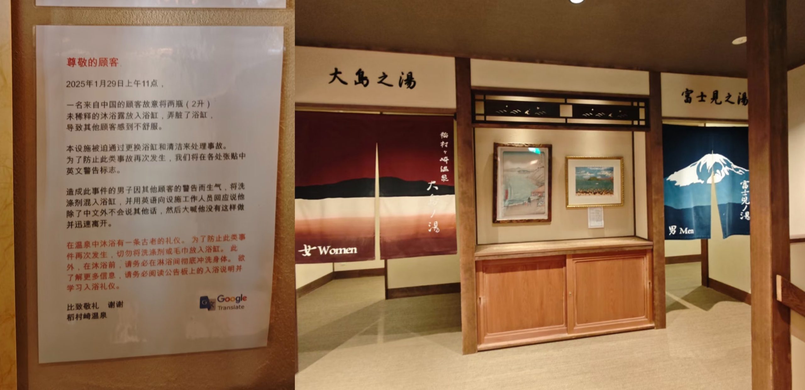 在神奈川县镰仓市稻村崎温泉,一则店内告示被网友拍照上传至社交媒体。告示写道,1月29日,一名中国籍男性顾客将两瓶沐浴露倒入浴缸,致浴水受污染,其他客人无法入浴。该男子其后又与他人发生争执,并将洗涤剂投入温泉。温泉方面只得更换浴缸并彻底清洁。