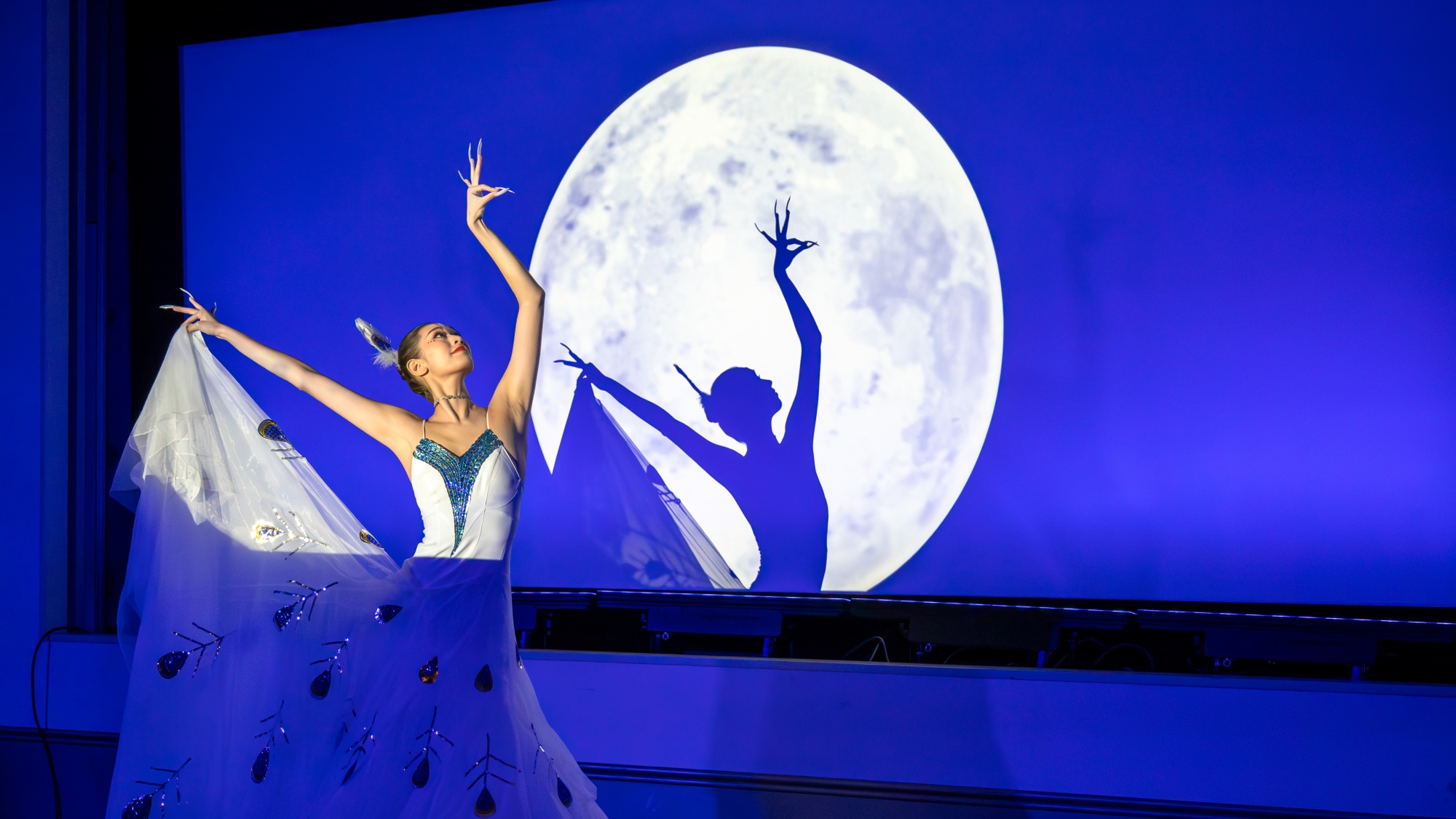 著名舞蹈艺术家杨丽萍创作的经典舞作《孔雀舞》随后登场。伴随悠扬的傣族乐曲,舞者身着洁白服饰,指尖轻颤,宛如孔雀展翅生辉,传达出人与自然的深层对话。特别嘉宾、杨丽萍的外甥女、雀之灵传承人,专程从云南赴日,演绎了这一传世之作,博得全场热烈掌声。