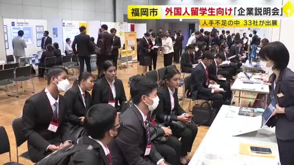 会场人头攒动,33家企业参展,涵盖建筑、酒店等行业,约600名留学生到场。由于人太多,不少人只能站着听。企业方面坦言,建筑业等行业正面临严重的人手短缺,希望留学生能承担翻译及生活支援等角色。帝国数据银行的调查也显示,福冈县约一半企业感到正社员不足。
