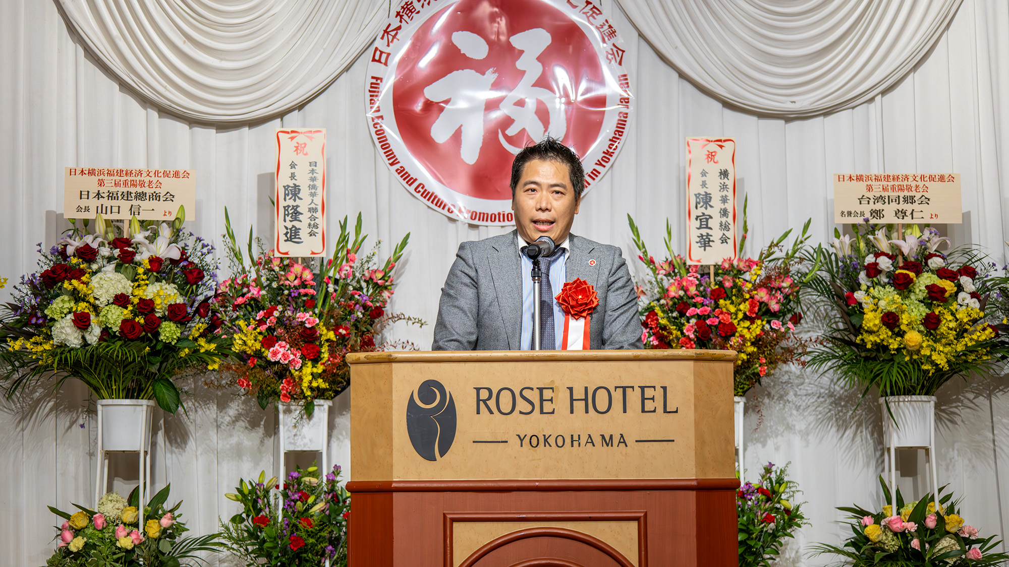 日本横滨福建经济文化促进会会长游群代表主办方首先致辞。游群会长介绍了重阳节敬老爱老活动的由来。活动已经坚持举行了三届,从“老吾老以及人之老”的小规模聚会,成为弘扬中华文明、传承民族精神的标志性活动,参与者也从日本本地侨胞扩展至世界各地同胞。所有参与者,不分地域,不论故乡,都是华夏儿女,重阳节敬老爱老活动,不仅是用实际行动向前辈乡贤展示孝义的机会,更是团结的聚会,是弘扬文明的聚会。