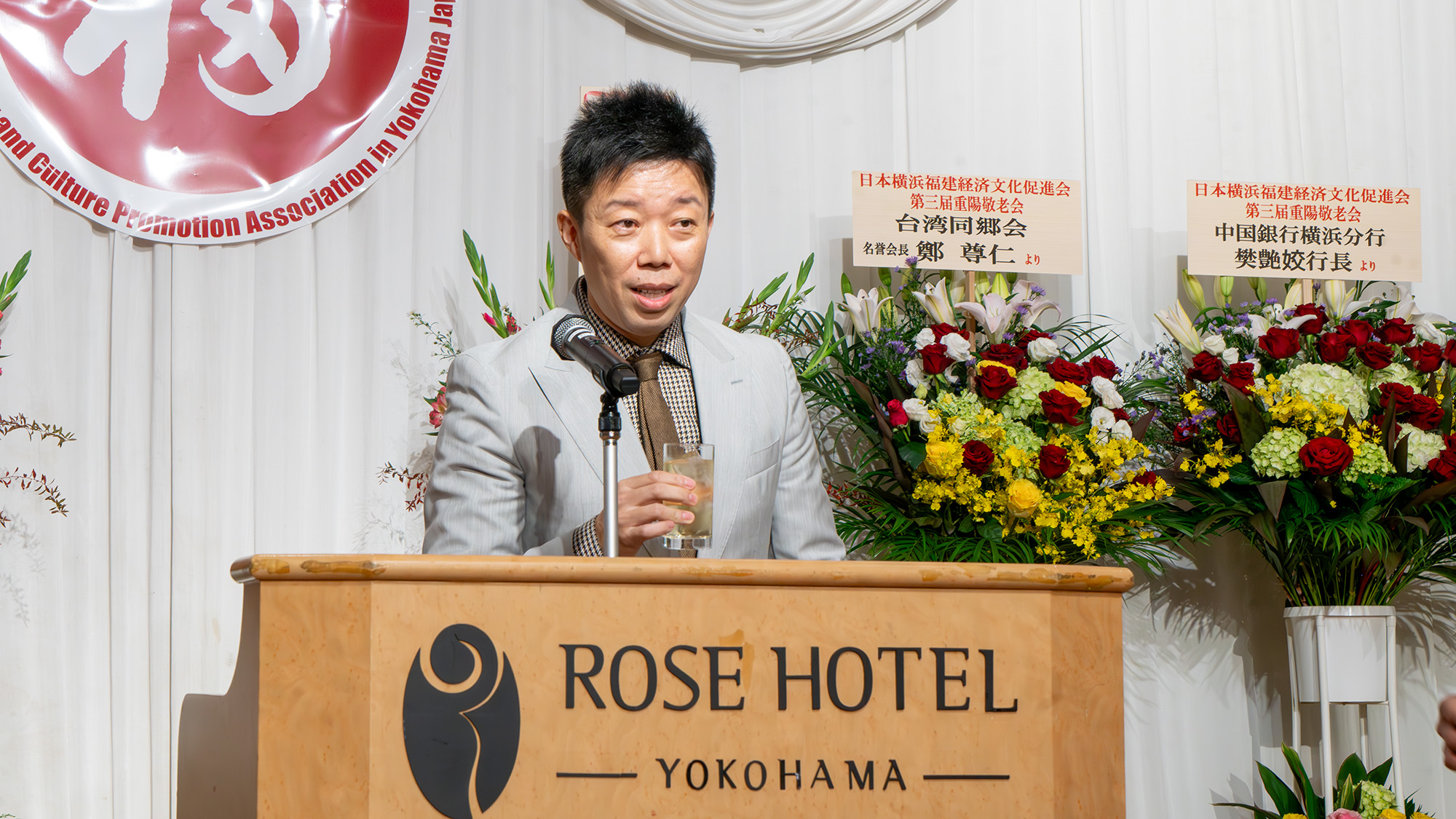 日本横滨福建经济文化促进会副会长藤井健的祝酒词,用福建人特有的风趣幽默将风土人情与家风人伦巧妙的融为一体,让重阳老人与到场嘉宾不禁莞尔。