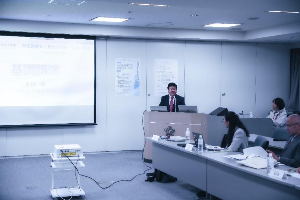 山梨学院大学校长青山贵子致开幕辞。她首先感谢各位与会者,特别感谢担任本次研讨会主旨演讲的大阪大学名誉教授古川裕以及拨冗前来参会的中国驻日本大使馆公参杜柯伟。接着介绍了山梨学院大学在建设高度国际化大学、积极推进各项国际交流事业领域的重要实践,并指出孔子学院、全球学习中心和国际共同研究中心在本校的外语教育、文化交流、国际合作方面取得的显著成就。青山校长期待,本次研讨会可以探讨在AI与数字技术不断革新的今天,“人”通过“语言”与“文化”相互连接的过程中将会如何发展,她表示希望本次研讨会能够成为推动外语教育与跨文化理解深化的有益平台,并为构建多样而富有共情的国际教育贡献新的理念与方向。