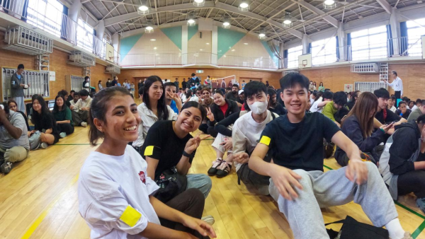正和旁边同学打闹说笑的卷发男同学,来自孟加拉;扎马尾的“黑美人儿”,今年刚从菲律宾来到日本的,性格开朗的她,很快就习惯了留学生活;长相甜美、声音柔和的中国小姐姐,到了赛场之上,完全变了一个人,为了集体荣誉而努力,可是咱们中国留学生从小就养成的好习惯。