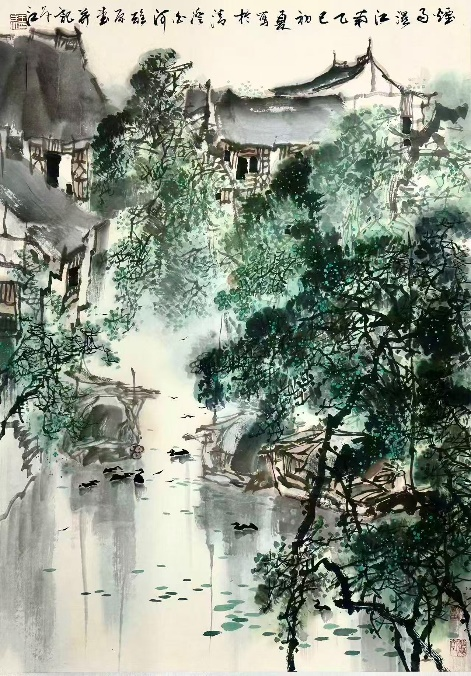 讲座后,我仔细欣赏了各位画家的作品。子江老师参展作品是彩墨画《烟雨湿江南》,令人钟情。淡淡的烟雨中,江南水乡的白墙黛瓦,朦胧雨色里悠悠停泊着乌篷船,树梢似乎滴雨,点点绿叶衬托,令人想象空气中飘荡着一种安详和静谧。子江老师作品中最大特点之一,我个人认为是雨色。这雨色在京都、在江南又有不同。子江老师京都的雨色里有小巷的灯光和烟火,有舞妓温柔的问候,也有木屐踩石巷的回响;而江南的雨色,则是水乡的沉静,是船橹在淅沥中的鼾声,是中国人心头莫名的乡愁。