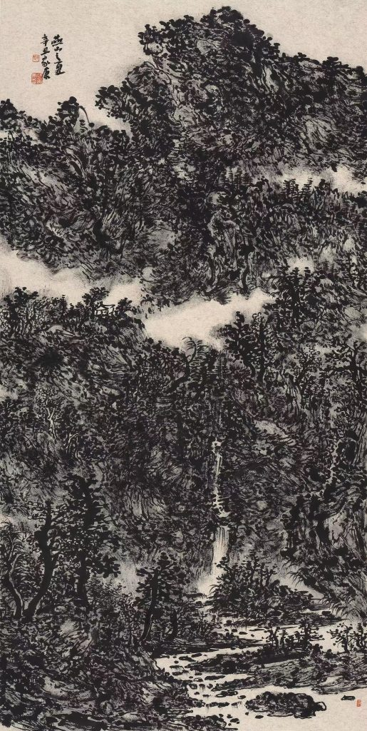 徐家康先生参展作品是《燕山之夏》。这是一种叫焦墨山水的画法,即采用纯焦墨而不借助水的渗透作用,却使画面具有滋润感和层次感。《燕山之夏》画的是一座树木繁茂而凝重幽静的山水,山体墨色浓重,深邃沉静,富有层次感和韵律感。而与之对照,山间瀑布则自成清凉,演绎一种禅意和诗性。观者立足画前,一种对大自然的敬畏油然而生,又莫名感受一种不可言说的内心宁静,使人停下来自省。也许,这就是艺术的力量。