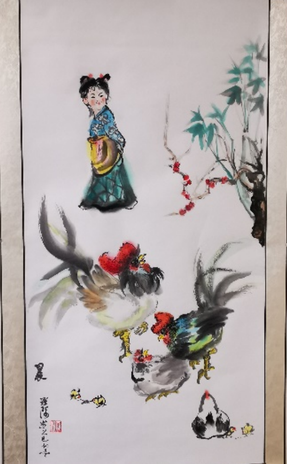 一幅是罗洁的彩墨作品《晨》,画中院子里,一位小女孩在回头笑眯眯地看着院中的几只鸡,鸡们则看起来又忙碌又吵闹。画中间一只红冠大公鸡在认真地仰头报时,旁边的一对公鸡和母鸡正在对话,它们一蹲一立,母鸡抬头专注凝视着公鸡,似乎在询问着什么,公鸡在聆听,又似乎在思考该如何回答母鸡的问题。他们身旁的两只小鸡正高兴地抢食着鸡爸爸刚捉来的虫子。右下角另一只鸡妈妈也在关注着自己的鸡宝宝进食。画中每一个角色都表情丰富,又充满了一片鸡社会鸡家庭的祥和。园中一支红梅在悄然开放,与绿色的竹叶形成了恰好的颜色对照,大公鸡颜色斑斓的羽毛和女孩漂亮的连衣裙颜色相辅相成,整个画面充满了跃动的生机和快乐的小故事,而女孩远远回头观望,那上学离家前投向它们的关注的目光和笑容,又形成了一种令人怀念的温暖。这种抓住生活瞬间的活泼表现,让我在画前不禁被笑容浸润。