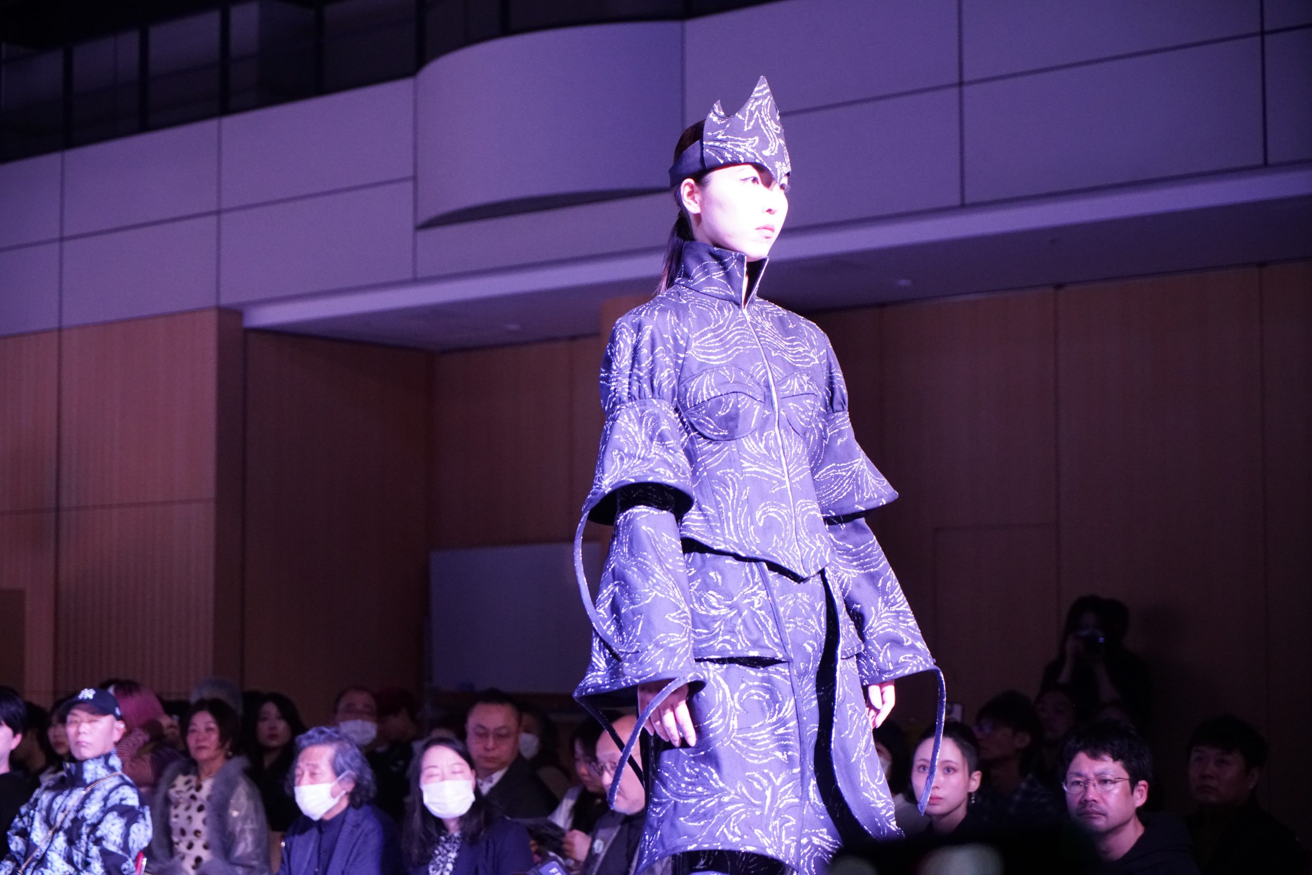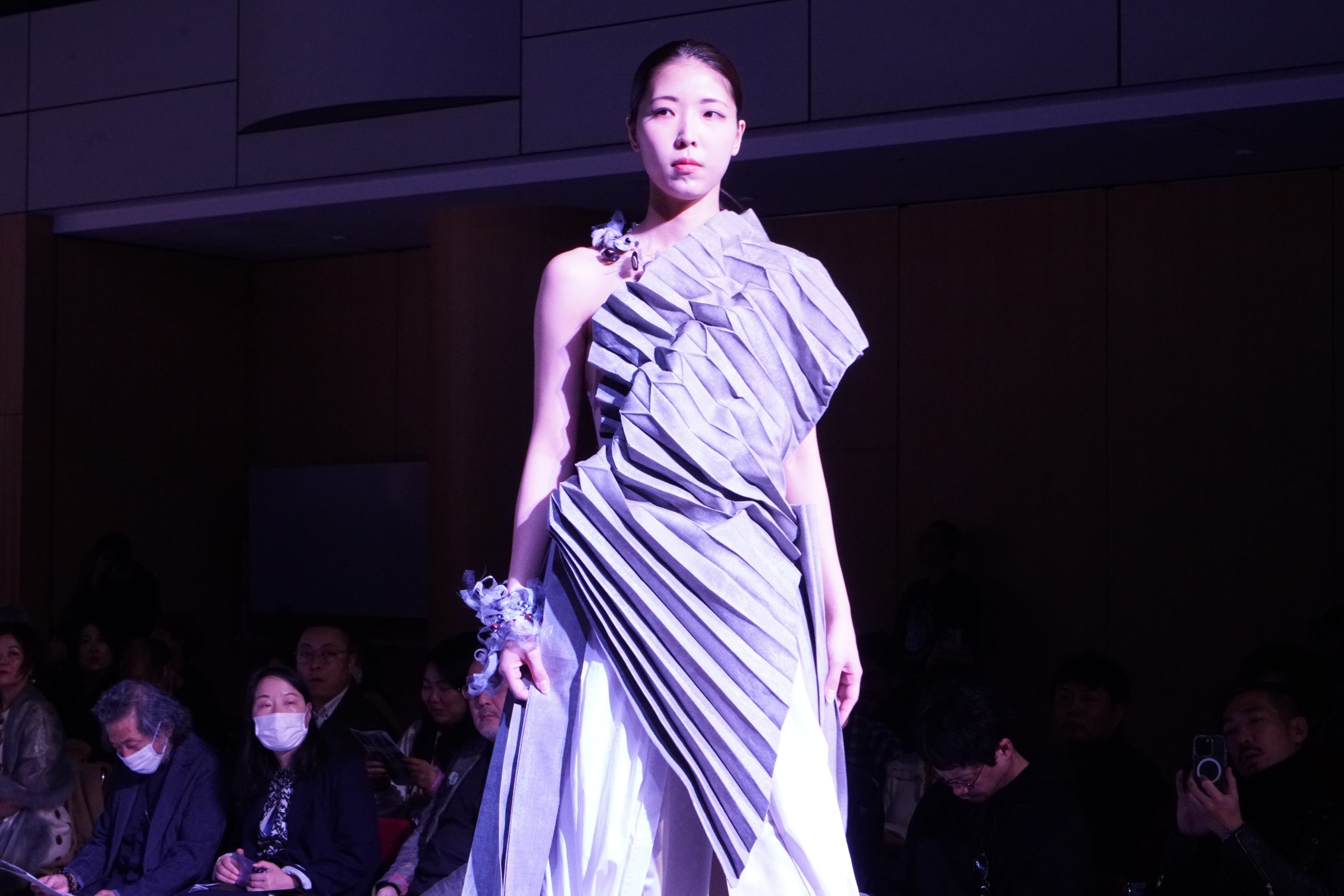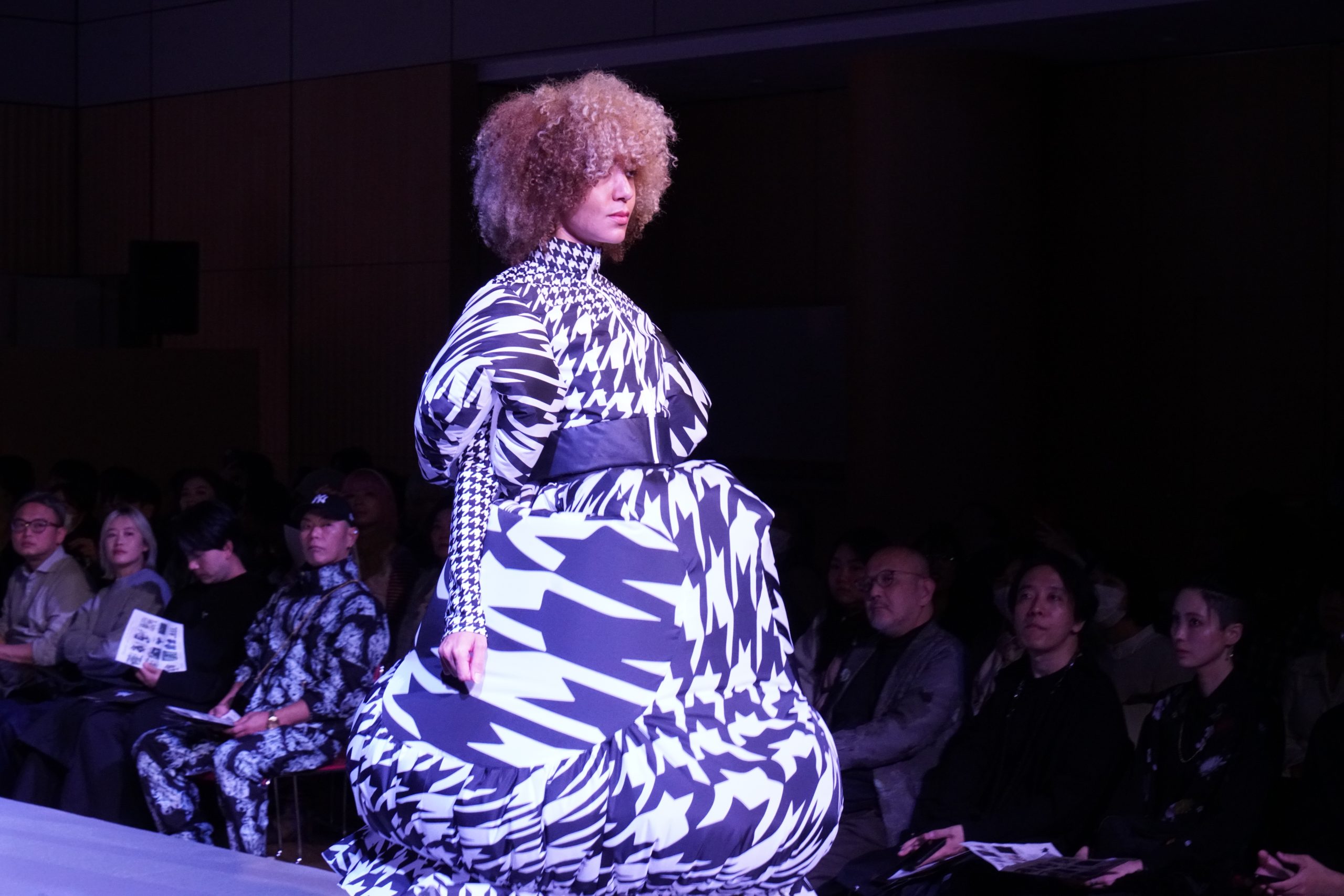 大赛共征得1000余件设计稿,通过初赛、复赛等阶段的严格甄选,最终有35件作品脱颖而出,进入总决赛。总决赛现场,名古屋模特学园的横田龙侍携作品《Swing check》正式吹响总决赛的集结号,从“侘寂”等日本传统文化理念,到女性视角的多元表达,以及对环保等问题的关注,35组选手用形式各异的介质和剪裁表达了各自的时尚理念,引来无数镜头的追逐。