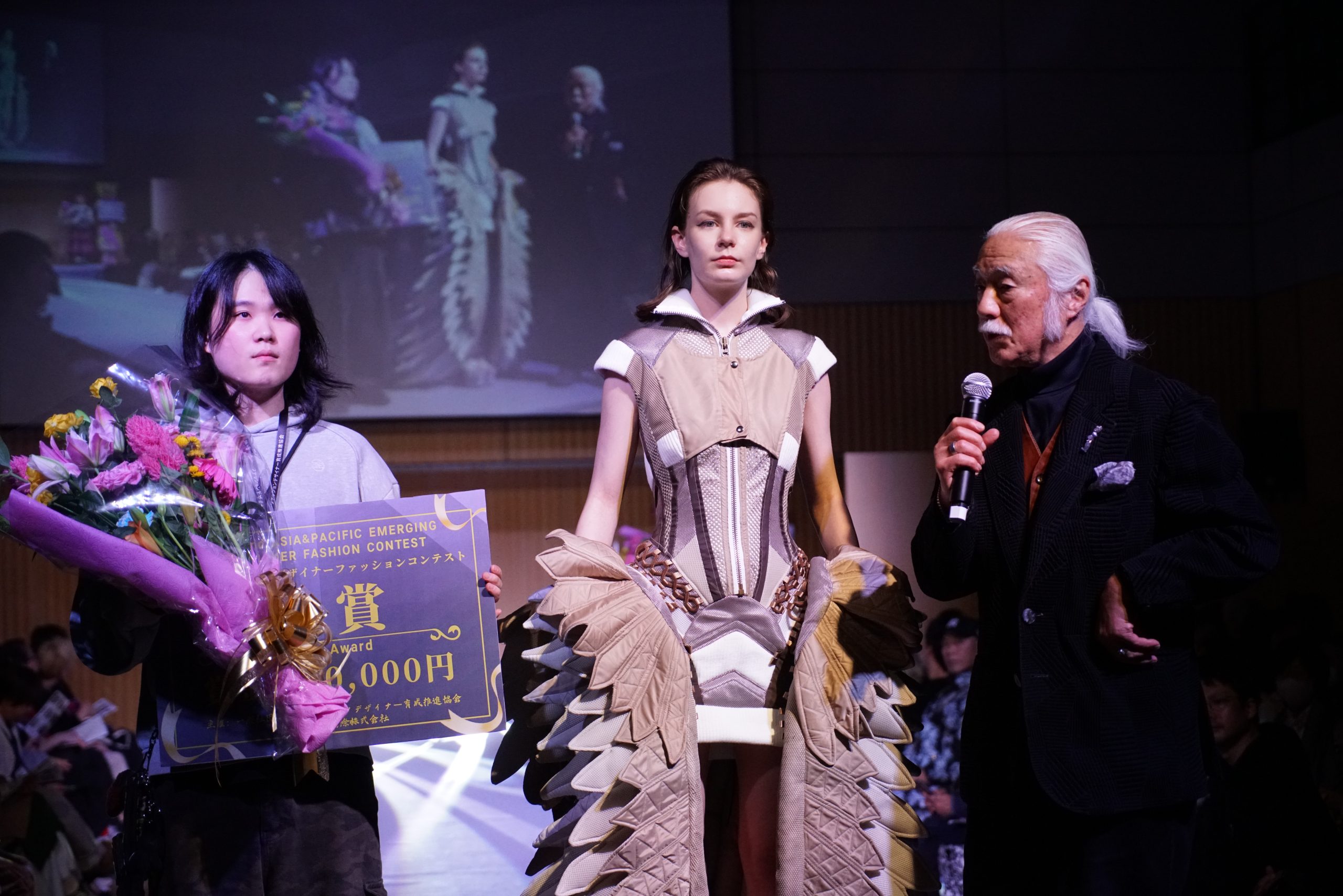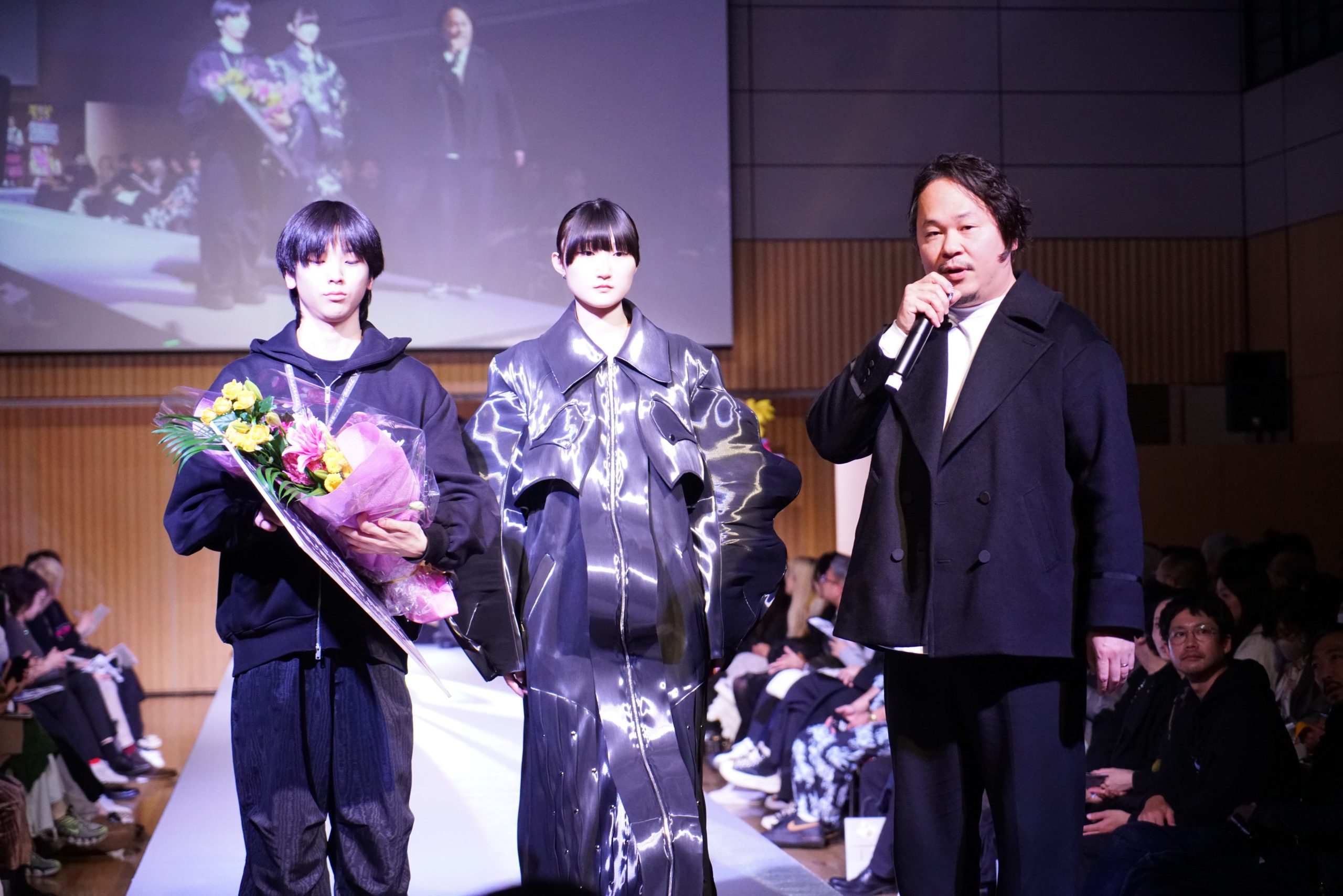 来自日本大阪文化服装学院的片山公贵携作品《DISTORTION》参赛并最终斩获银奖。中园渡为片山公贵颁奖,并称赞他借助不平衡感的剪裁表现“失真”的主题,提醒人们对从大地的扭曲到社交媒体的变异等社会问题的关注,他的表现手法值得肯定。