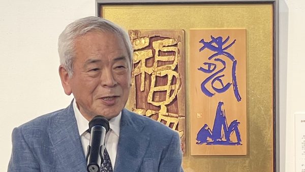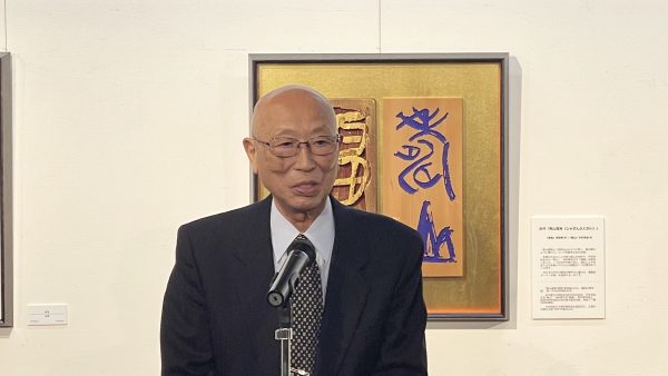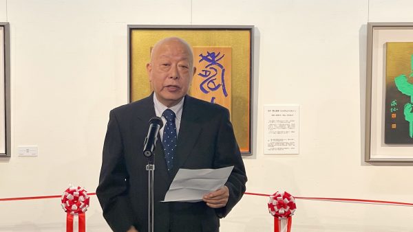 在热烈的掌声中,两位大家先后登台致辞。竹市求仙对能够和何柏青一起在银座举办联展,感到非常荣幸,并由衷地感谢从各地赶来的嘉宾。“今年6月,值群马县高崎高岛屋开业六十周年之际,同时也恰逢竹市求仙本人从事刻字艺术60年,于是举办了共贺一甲子的纪念展。以那次展览为契机,策展人王庆明提议举行一个二人联展,最终促成今天这场盛会。何老师的作品带有非常浓郁的中国风,而我的作品则更多体现出日本风格。我从何老师的作品中学到了很多,也希望今后能够在不断欣赏、学习他的作品的基础上,创作出更多新的作品。真心希望这次二人展能够成为一个契机,把刻字文化从中日之间进一步推广到更多国家和地区,让更多的人了解、喜爱这门艺术。”