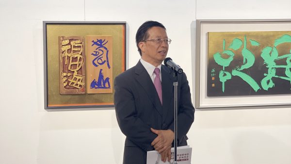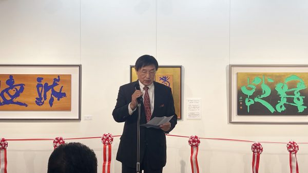 在举行了剪彩仪式后,由国际亚洲共同体学会副理事长、日本华人教授会创始会长、东洋学园大学客座教授朱建荣致祝酒词。正如竹市求仙所言,中日两国的刻字风格不同,黄星原代表在致辞中也提过汉字起源于中国,而刻字技术是中日之间相互学习共同发展的结晶。所以本次联展就有了一个关键点——“相互切磋与融合”。除了中日两国之间的文化互动促进之外,两位先生在各自的艺术探索中也都体现了“融合”的特点。竹市求仙是终生追求佛法与刻字艺术相结合的艺术家,把佛法的精神性融入作品之中。何柏青以开阔的视野,深厚的文化底蕴,将对文学、社会和时代的理解体现在了刻字艺术当中。今天的展览呈现的不仅仅是简单的刻字,而是一种文化的综合,以及两位大家把各自的人生体验、思想认识与智慧相互交织之后形成的结晶,这也是中日两国文化在当代交流与融合的一种生动体现。祝两位先生的画展取得圆满成功,也祝中日关系迎来新景象。