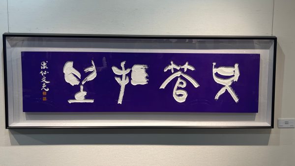 刻字艺术的魅力,在于将毛笔的轻重缓急转化为雕刀的深浅起伏,或辅以彩漆,或用不同手法的打磨创造出不同的光影面貌。展厅内展出的竹市先生的作品多以佛教典籍为题材,辅以彩漆;何先生的作品则仅使用木材和汉字来表现,在对木材的刻画打磨中赋予作品不同的质感。两位艺术家在同一个艺术领域中的不同艺术表现,体现了本次中日两国刻字艺术的共同基础——来自同一个源头“汉字”,但又以不同形式表现出来,并让各自特色交相辉映,产生共鸣的艺术效果。