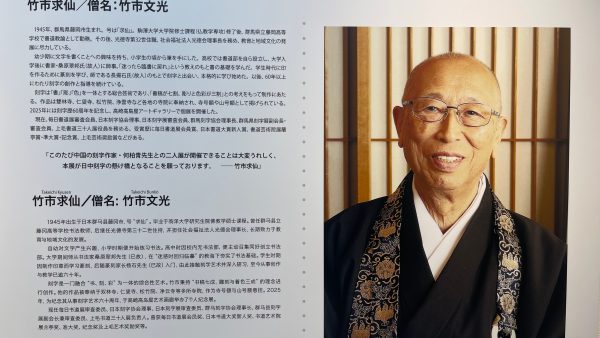 竹市求仙,现任光德寺住持,僧名竹市文光,多年致力于佛学钻研、社会教育与地区文化发展,担任社会福利法人光德会理事长及其他社会职务。他从小学时代开始练习书法。高中时主动发起创立书法部,大学时师从已故书法家桑原翠邦,夯实了书法基础。同时开始学习篆刻,拜师于已故篆刻家 长杨石先生,从此埋头于日本称之为刻字的篆刻艺术孜孜不倦60年。他的作品被多所寺院收藏,作为寺号或山号匾额悬挂,历任每日书道展评审委员,日本刻字协会理事,群马刻字协会理事长等。其作品曾被颁予每日书道展会员奖、日本书道大奖新人奖、书道艺术院长兰亭奖、准大奖。今年6月为纪念从事刻字艺术60周年,在高崎高岛屋艺术画廊隆重举办了个人纪念展。