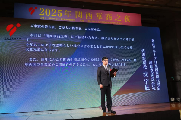“2025年关西华商之夜”的成功举办,离不开多家合作企业的支持,对本次活动提供协助的企业进行了表彰,并由贵州茅台酒日本关西地区总代理清泉堂株式会社的负责人代表受表彰企业发言。