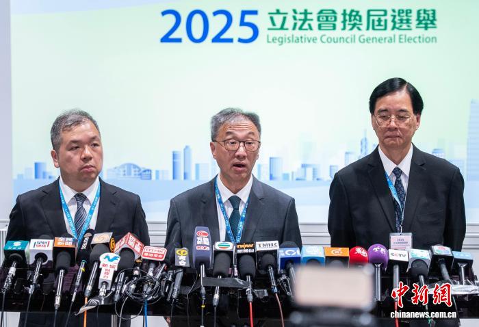 12月8日凌晨,香港特区选举管理委员会主席陆启康(中)等在位于香港会议展览中心的中央点票站新闻中心会见记者,介绍香港特区第八届立法会选举的投票情况。 中新社记者 侯宇 摄